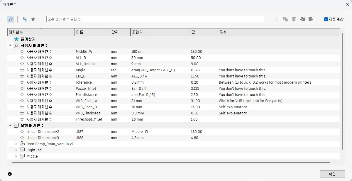 Các file STL/STEP mặc định được tải lên phù hợp cho ngưỡng cửa cao 9 mm và rộng 800 mm. Ngoài ra, các file trong thư mục _ChamferedVHB đã được chỉnh sửa để dùng kèm keo dán; phần đáy của dốc (tiếp xúc với ngưỡng cửa) được khoét lõm 1.6 mm để vừa vặn hơn và có thêm rãnh 0.3 mm dành cho băng dính hai mặt loại 30 mm.