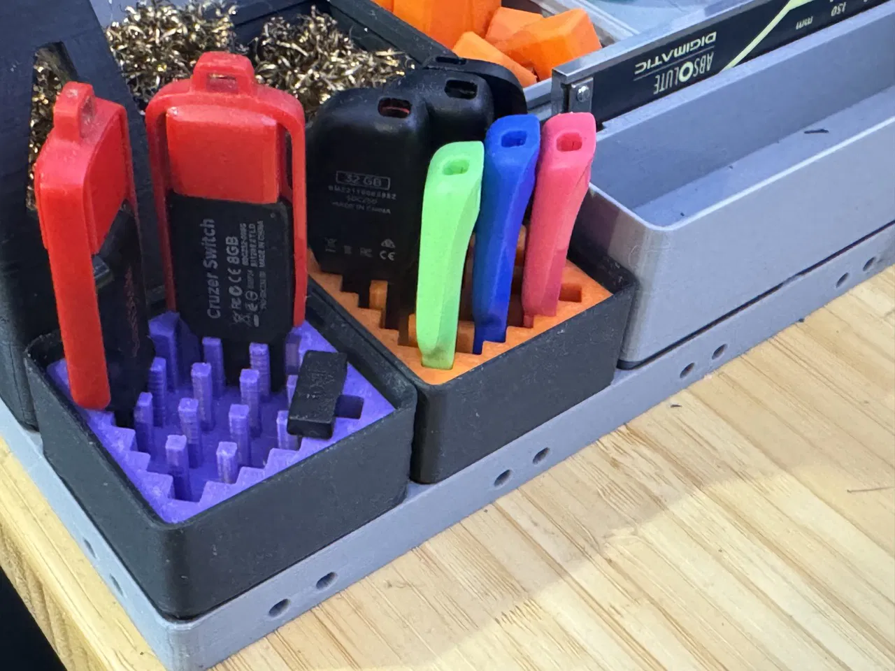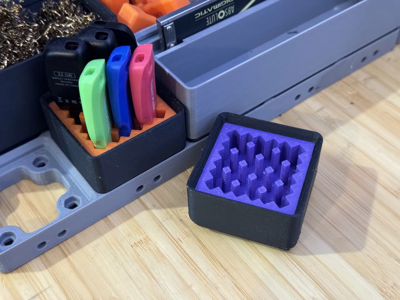 Đây là một bộ khay Gridfinity đi kèm với phần đế chèn giúp bạn sắp xếp và lưu trữ các USB theo đủ loại cách hoặc kiểu dáng khác nhau.