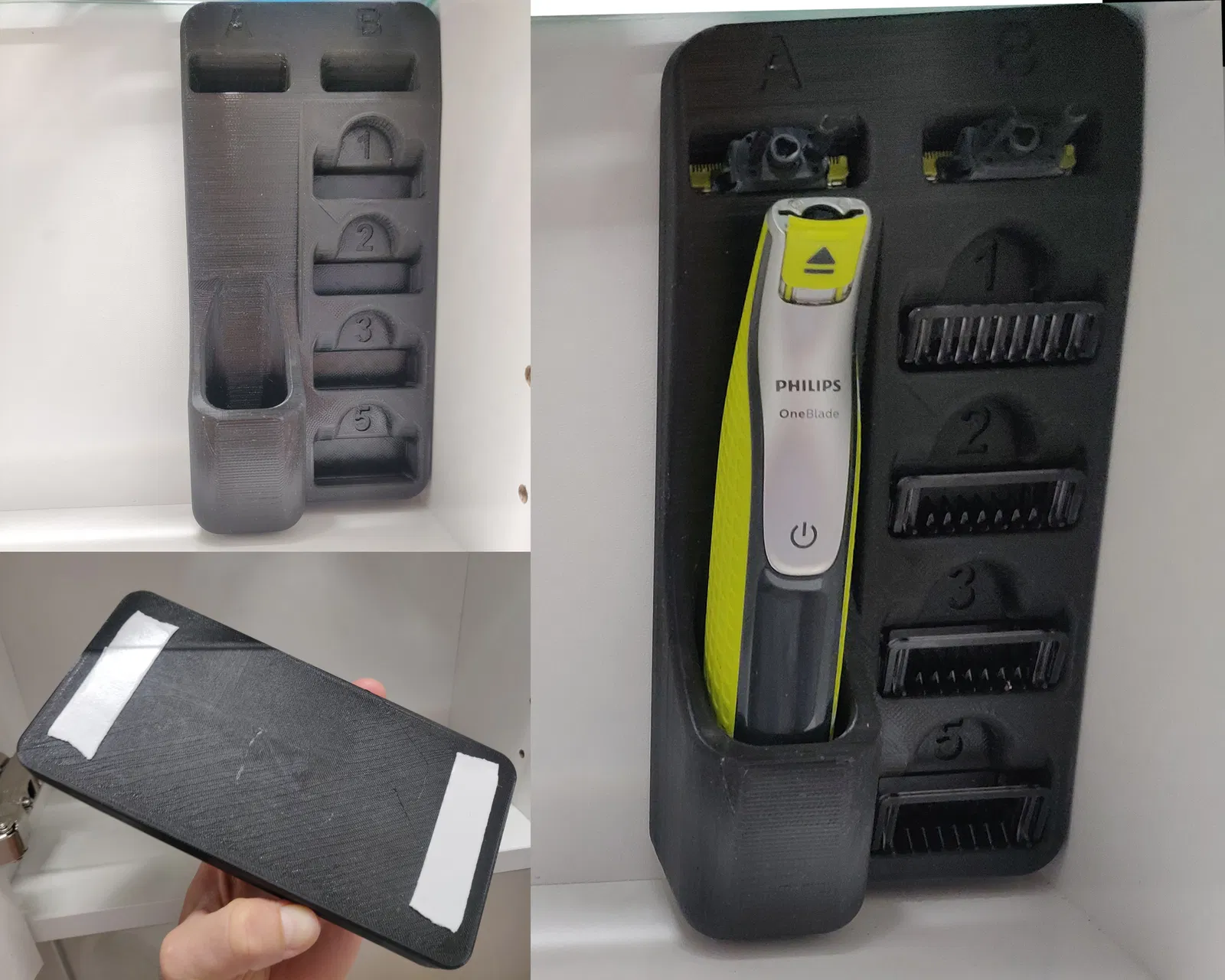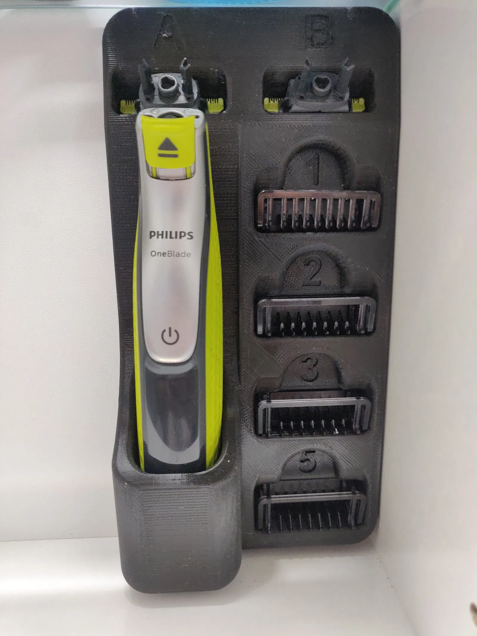 Giá đỡ tiện lợi cho máy cạo râu PHILIPS OneBlade và bộ 4 đầu tỉa (1mm, 2mm, 3mm, 5mm). Phiên bản v2 được cải tiến với khả năng bắt vít chắc chắn, dung sai rộng rãi và hỗ trợ in 2 màu đẹp mắt.