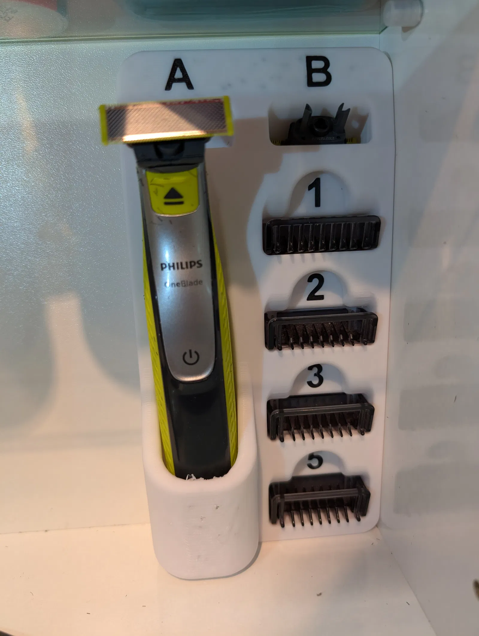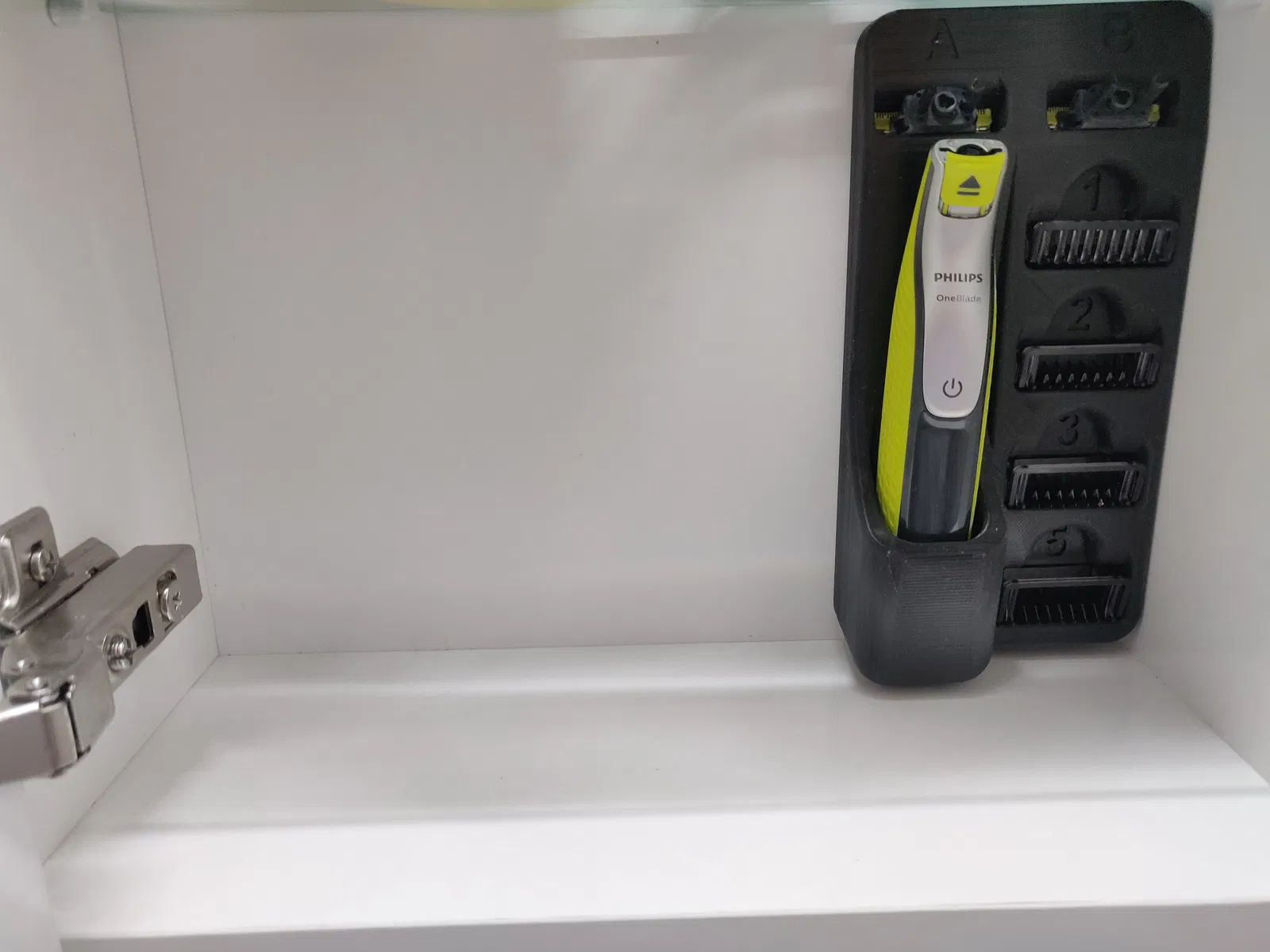 Một chiếc giá treo tường cho tủ phòng tắm, ví dụ là vậy. Nó vừa vặn cho máy cạo râu PHILIPS OneBlade và các phụ kiện đi kèm.