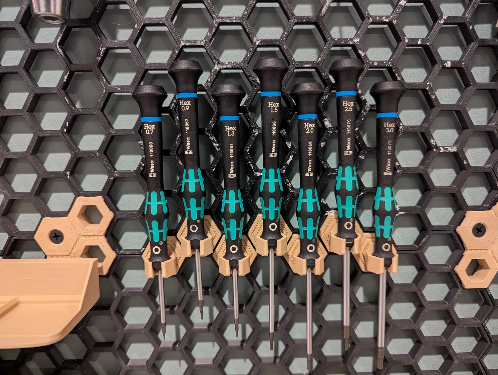Các giá đỡ riêng lẻ cho bảng Honeycomb Storage Wall (HSW) được thiết kế riêng cho dòng tua vít Wera Kraftform Micro. Thiết kế nhỏ gọn, cho phép xếp so le tiết kiệm diện tích và dễ dàng lấy tua vít mà không cần nhiều khoảng trống phía trên.