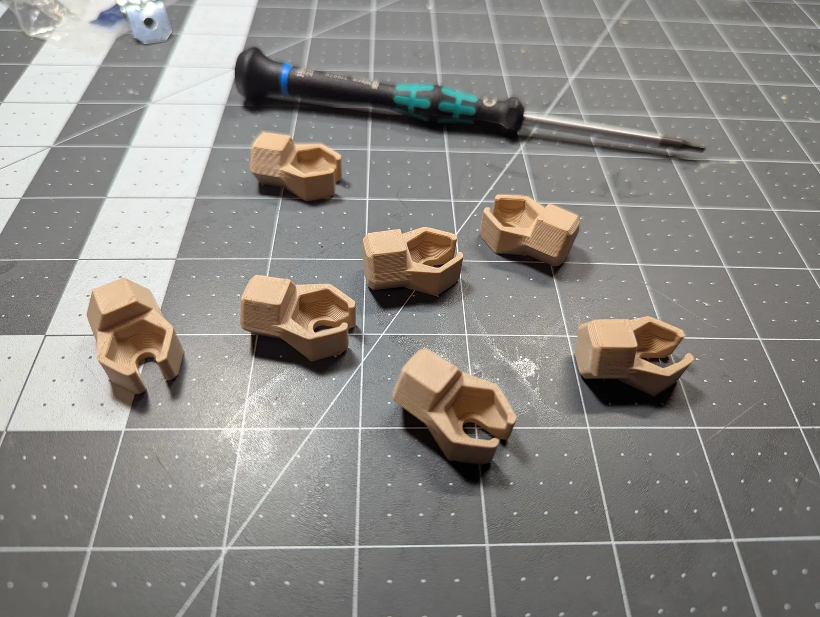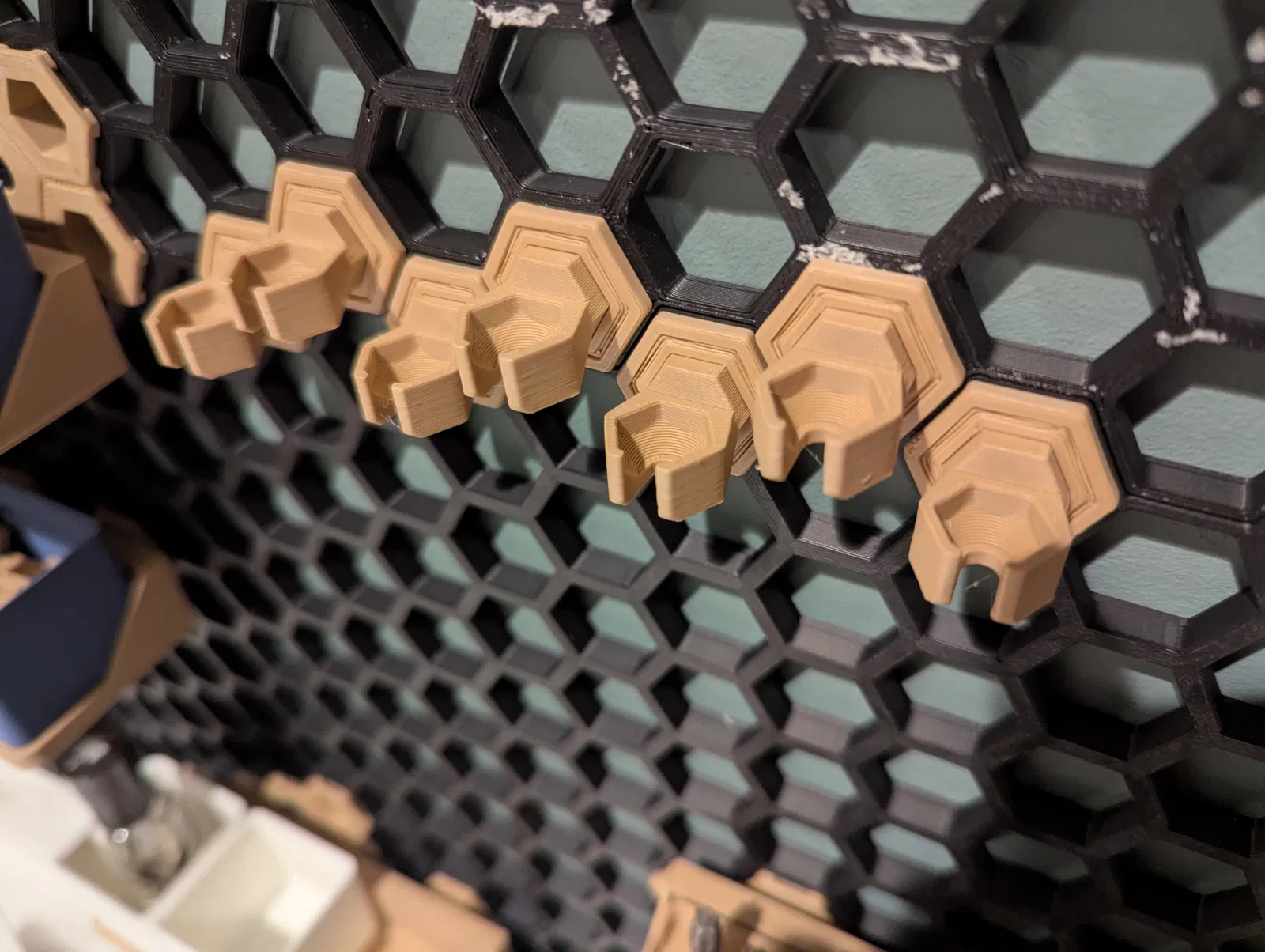 Đây là các giá đỡ riêng lẻ có thể sắp xếp so le, cho phép bạn in số lượng tùy nhu cầu (mình đang dùng bộ 7 cái mà chưa thấy mẫu nào khác tương tự). Phần đế được thiết kế nhỏ gọn để bạn có thể xếp khít nhau như trong ảnh nhằm tiết kiệm không gian. Giá đỡ được tối ưu để bạn chỉ cần nhấc nhẹ tua vít lên là có thể lấy ra, không cần chừa trống một khoảng không gian lớn phía trên bảng HSW của mình.
