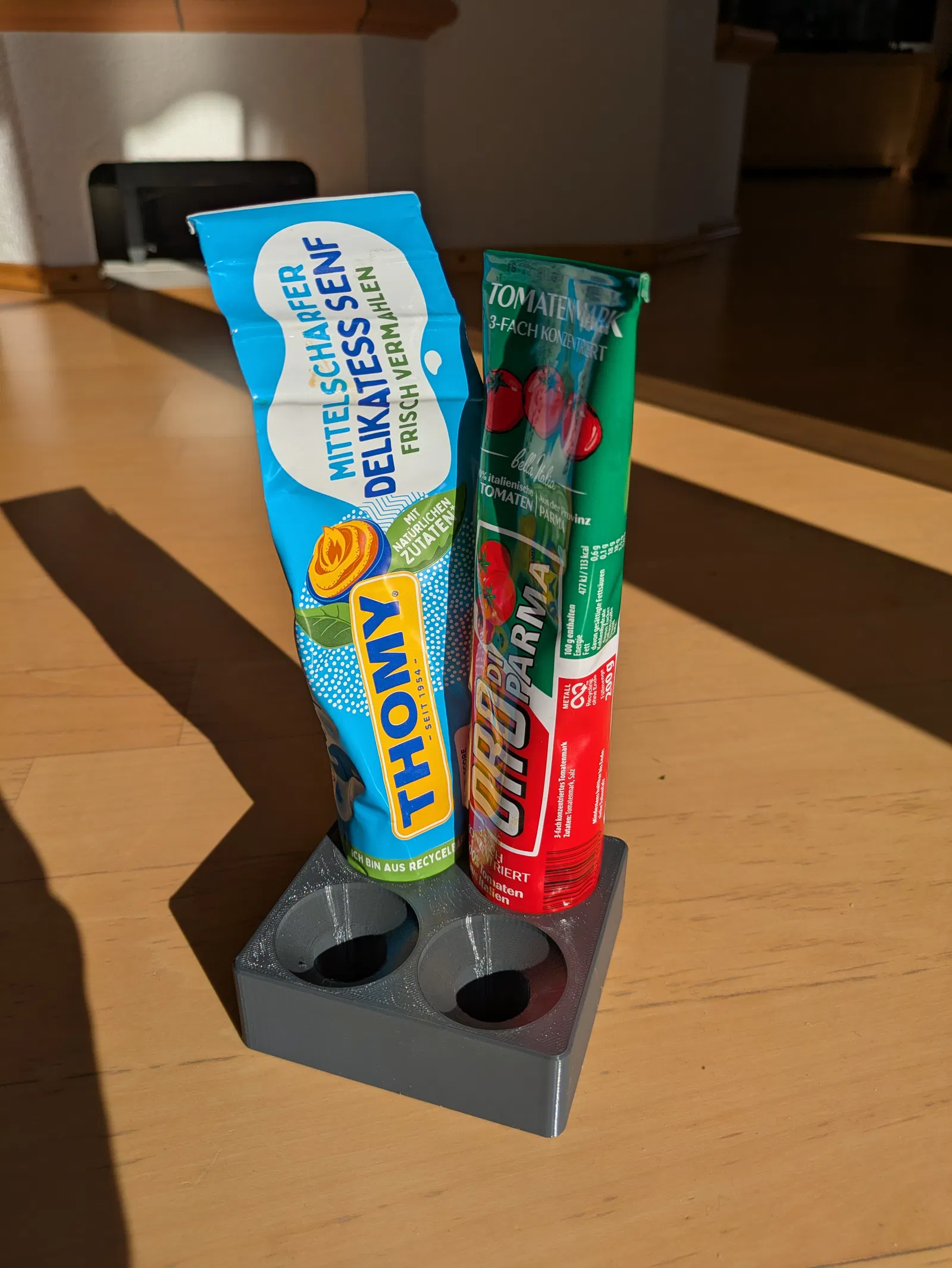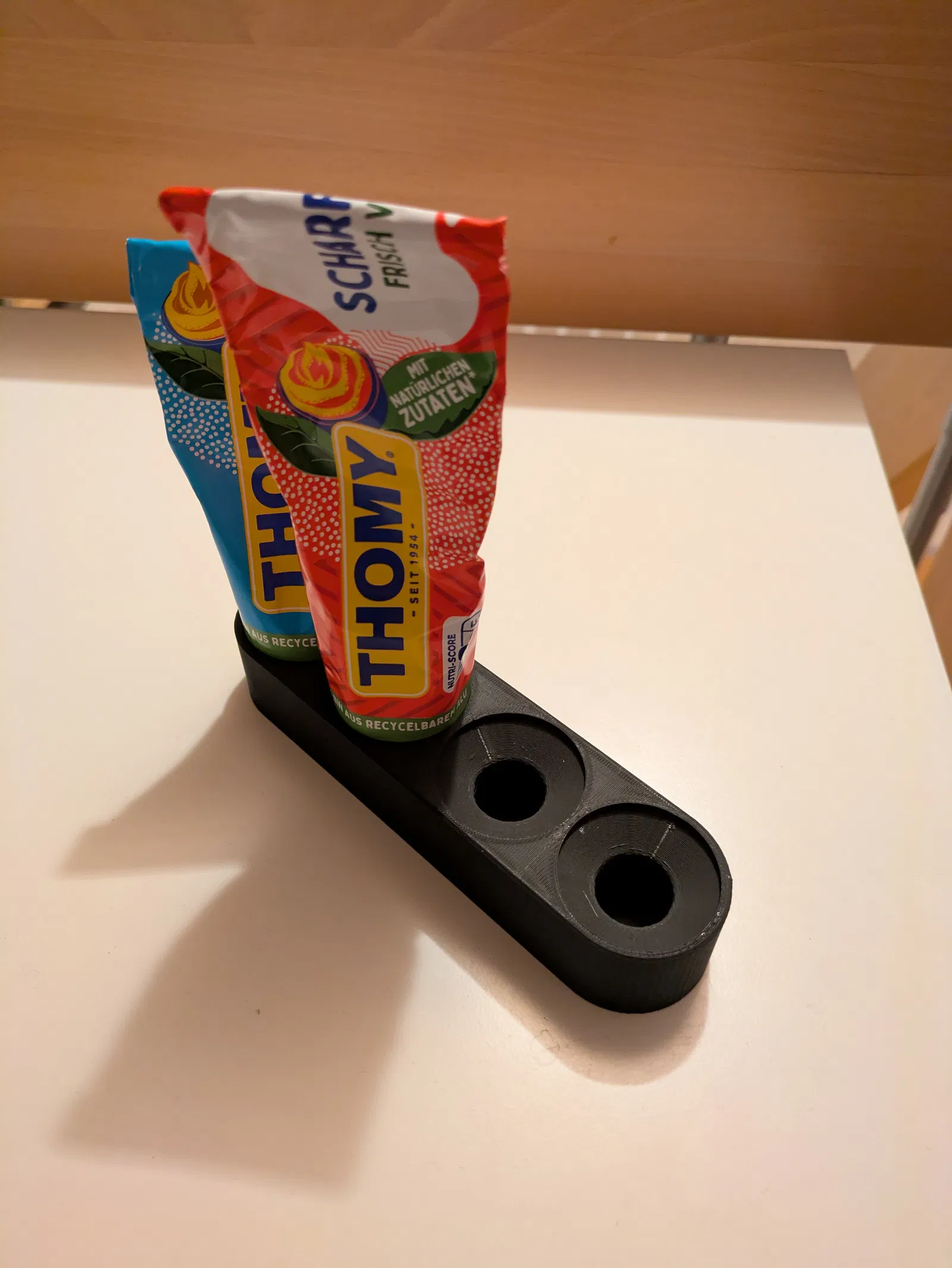 Hai phiên bản giá đỡ giúp bạn sắp xếp gọn gàng tối đa 4 tuýp đồ dùng (ví dụ như mù tạt). Thiết kế vừa vặn cho các tuýp THOMY, giữ cố định chắc chắn, không lo rơi hay đổ. In 3D dễ dàng không cần hỗ trợ, dùng tốt với nhựa PLA hoặc PETG.