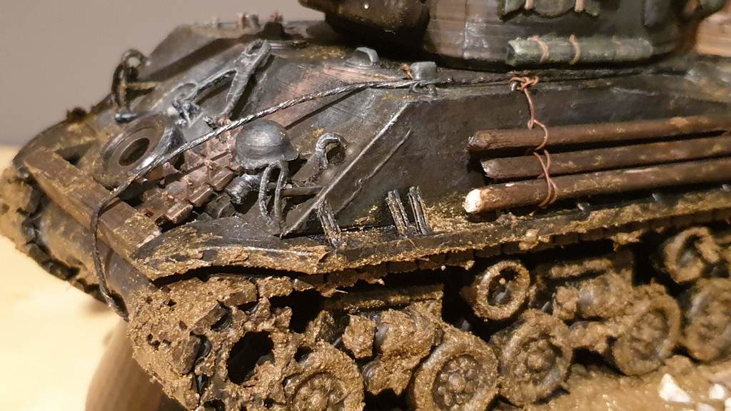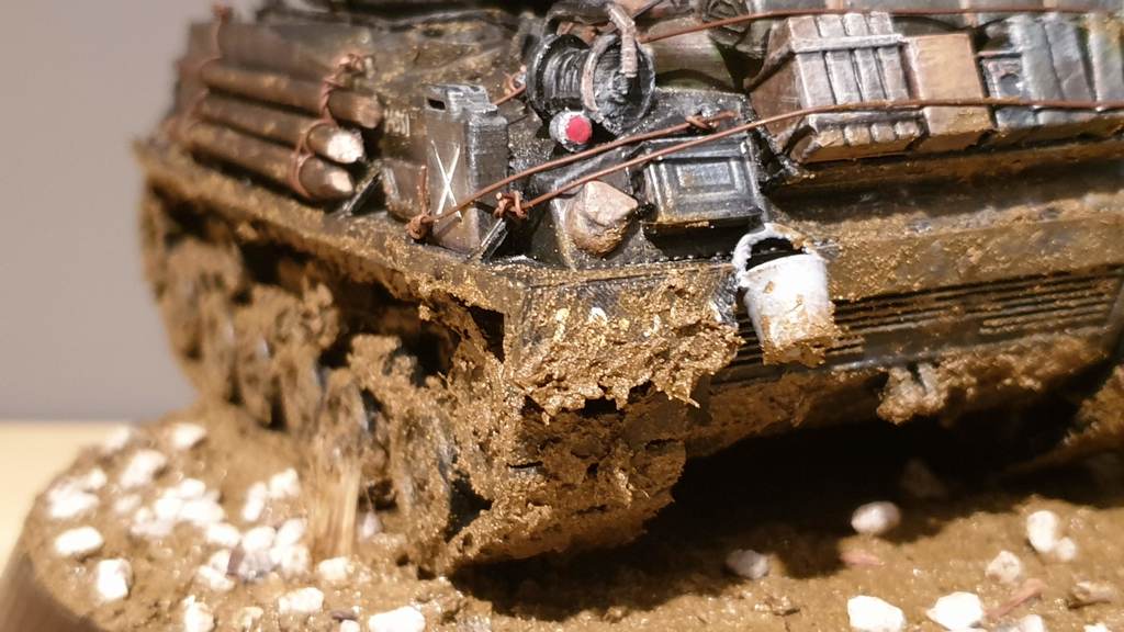 Một vài mẹo nhỏ khi làm mô hình: Bạn nên dùng Plastic putty (70.401) của Vallejo để đắp các mối hàn cho chi tiết hơn. Cáp thép thì mình dùng dây loa. Phần gỗ thì nên dùng wood filament để in. Còn phần bùn đất, mình dùng Thick mud (European mud 73.807) của Vallejo. Cỏ trên mô hình được mình tận dụng từ lông cọ sơn.
