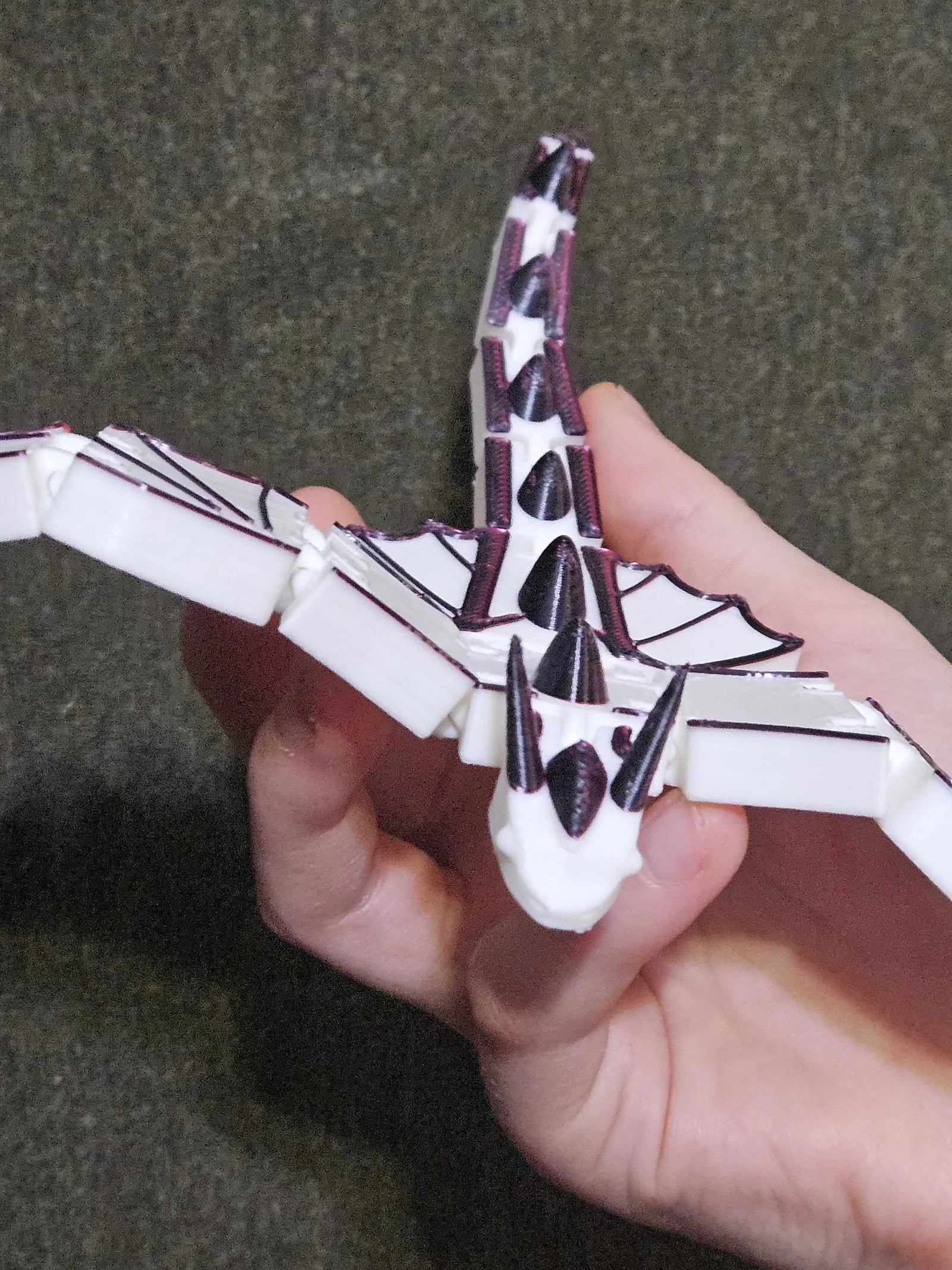 Để tạo điểm nhấn cho chú rồng thêm sinh động như trong hình, bạn có thể áp dụng kỹ thuật đổi màu sợi nhựa (filament swap) ngay trong quá trình in. Bạn chỉ cần thiết lập lệnh tạm dừng (pause) máy in ngay trước khi lớp nhựa bắt đầu tạo đường viền cho phần cánh và các gai lưng. Bằng cách thay đổi màu nhựa tại thời điểm đó, chú rồng của bạn sẽ trở nên nổi bật với hai tông màu tương phản, mang lại vẻ ngoài chuyên nghiệp và thu hút mọi ánh nhìn.