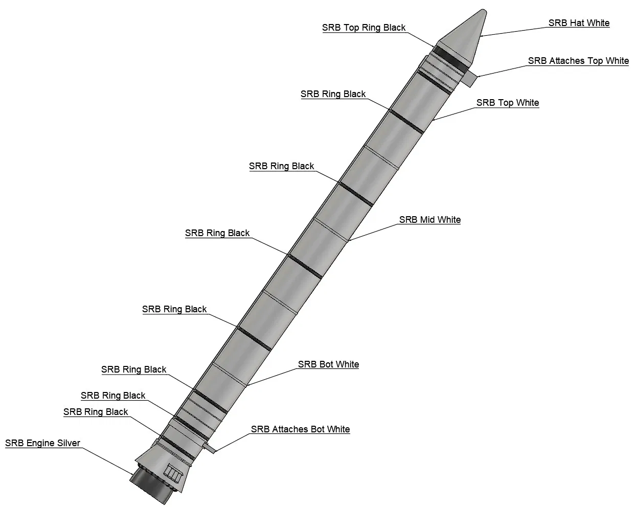 - Có tổng cộng 64 mảnh cần in, bao gồm 13 mảnh cho phần Solid Rocket Booster và 17 mảnh cho phần Core Stage.