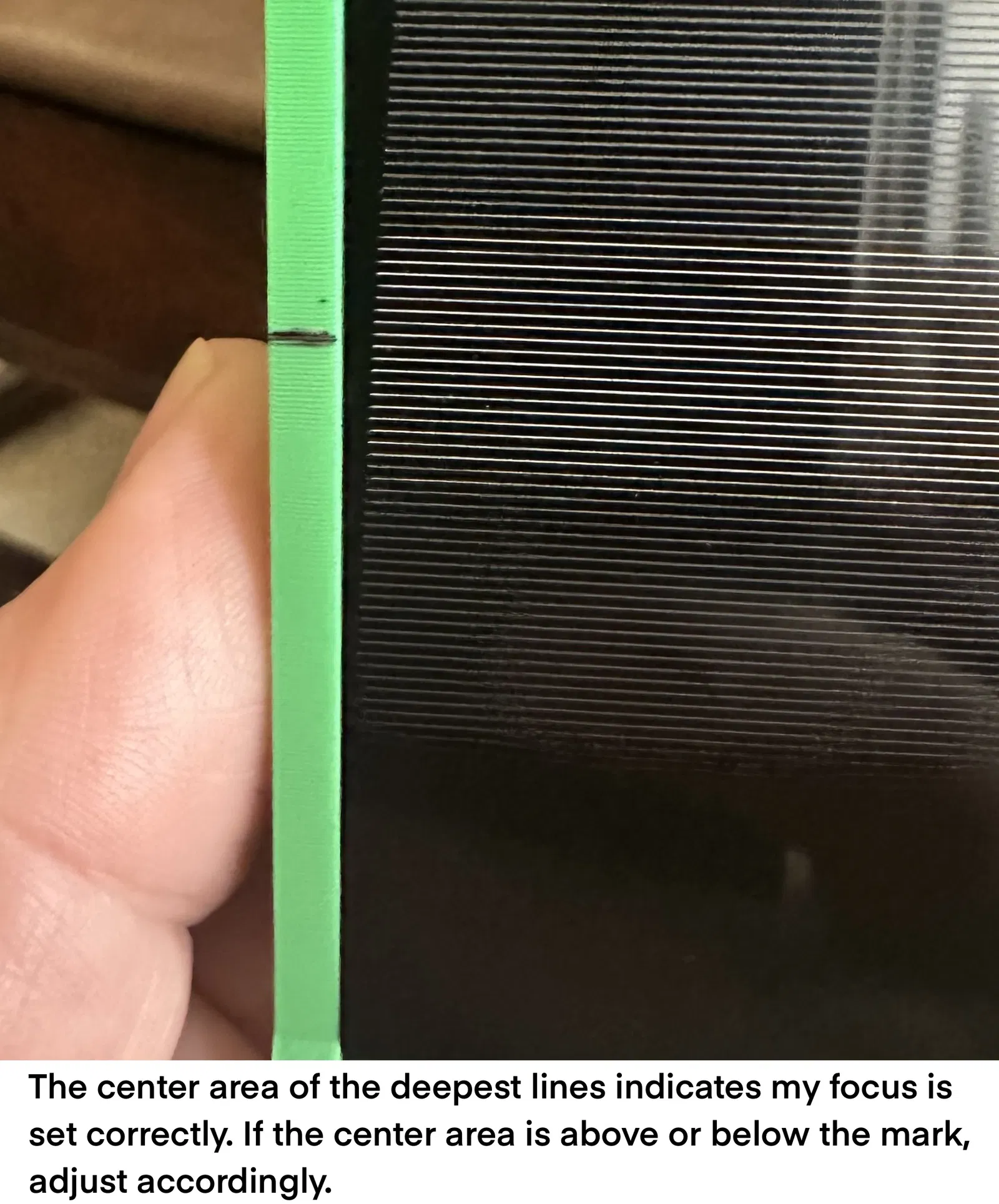 Sau khi chạy xong, nếu tiêu điểm đã chuẩn, dấu Sharpie của bạn sẽ nằm ngay vùng TRUNG TÂM của phần sâu nhất trên các đường khắc. Nếu dấu Sharpie nằm trên hoặc dưới vùng trung tâm, nghĩa là tiêu điểm của bạn chưa chuẩn; hãy điều chỉnh lại tiêu điểm và tiếp tục kiểm tra cho đến khi dấu nằm đúng giữa.