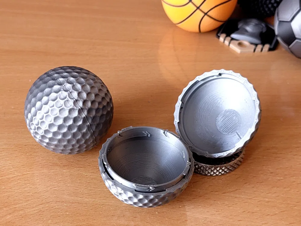 Một chiếc hộp hình cầu với thiết kế lấy cảm hứng từ quả bóng golf. Hộp sử dụng cơ chế khóa bayonet kép (twist&click) thông minh, tạo cảm giác rất đã tay khi đóng mở. Mẫu in gồm hai nửa hộp và một vòng khóa, mang lại trải nghiệm thú vị cho người chơi 3D printing.