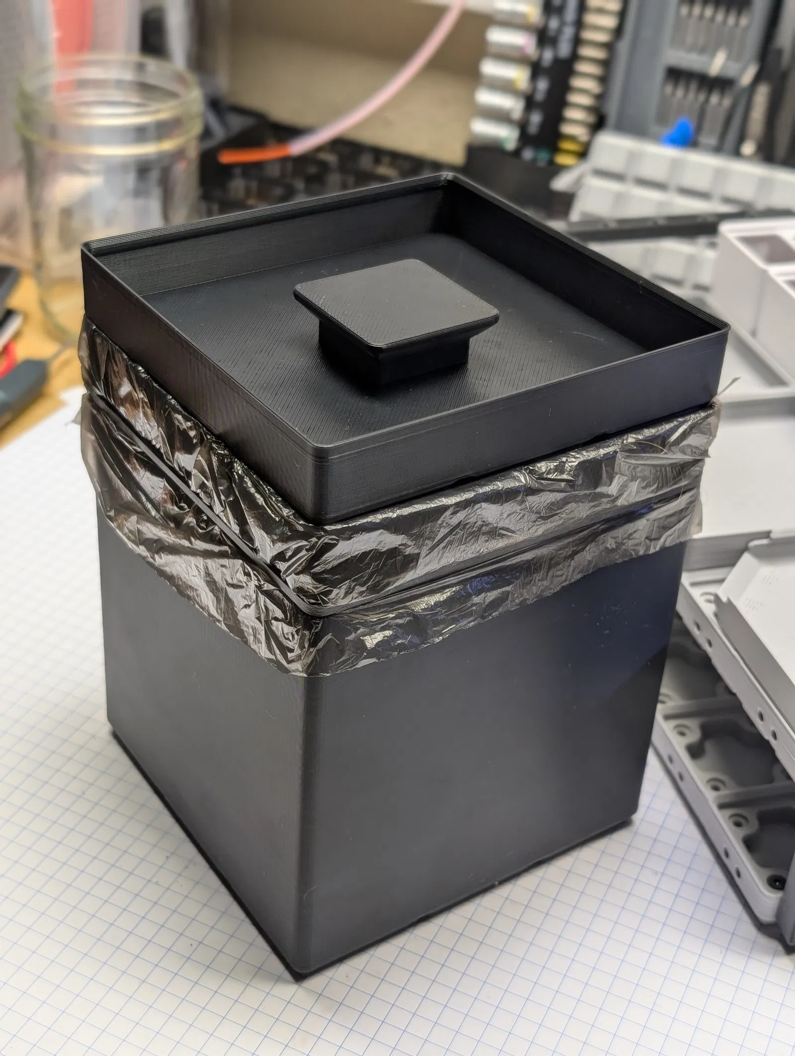 Đây là một chiếc thùng rác 3x3x24 dành cho hệ thống Gridfinity. Chiếc thùng rác để bàn này được thiết kế để bạn có thể tận dụng các túi đựng chất thải cho chó làm túi lót rác. Ngoài ra, nó còn có một khe lõm ở mức 3u để bạn dùng dây thun hoặc các cơ cấu kẹp khác giữ chặt túi vào đúng vị trí. Sản phẩm đi kèm nắp đậy 3u với tay cầm cực kỳ êm ái và tiện dụng. Bạn cũng có thể dùng chiếc nắp này cho bất kỳ thùng chứa 3x3 nào khác mà mình muốn. Đây quả là một chiếc nắp tuyệt vời, mình rất thích nó. Mình đã nói là chiếc nắp này làm mình thấy rất vui chưa nhỉ?