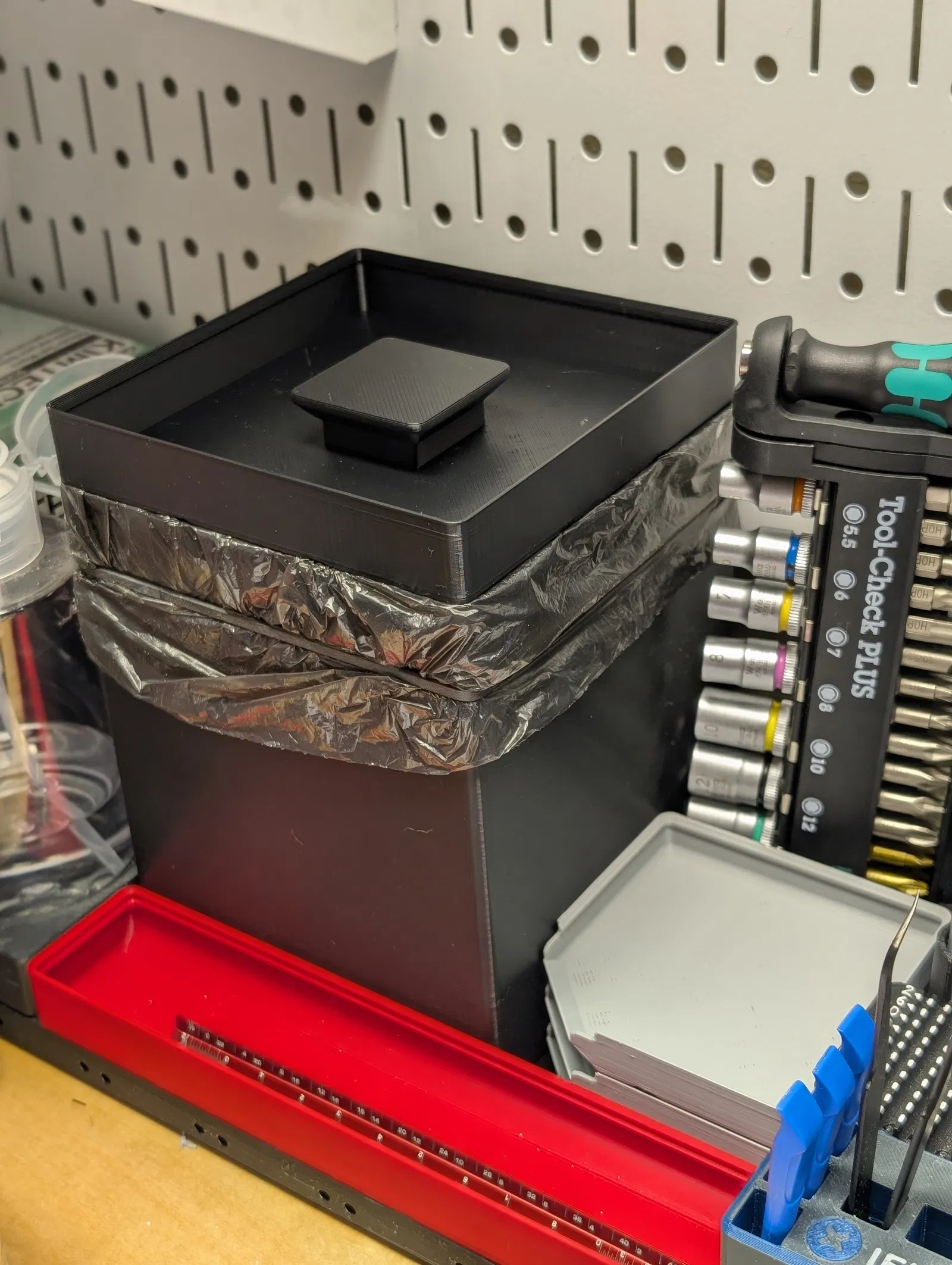 Chiếc thùng rác 3x3x24 dành cho hệ thống Gridfinity này được thiết kế để dùng chung với túi lót, đi kèm một chiếc nắp 3u có tay cầm cực kỳ tiện lợi và thỏa mãn khi sử dụng. Một món phụ kiện hoàn hảo cho không gian làm việc của bạn.