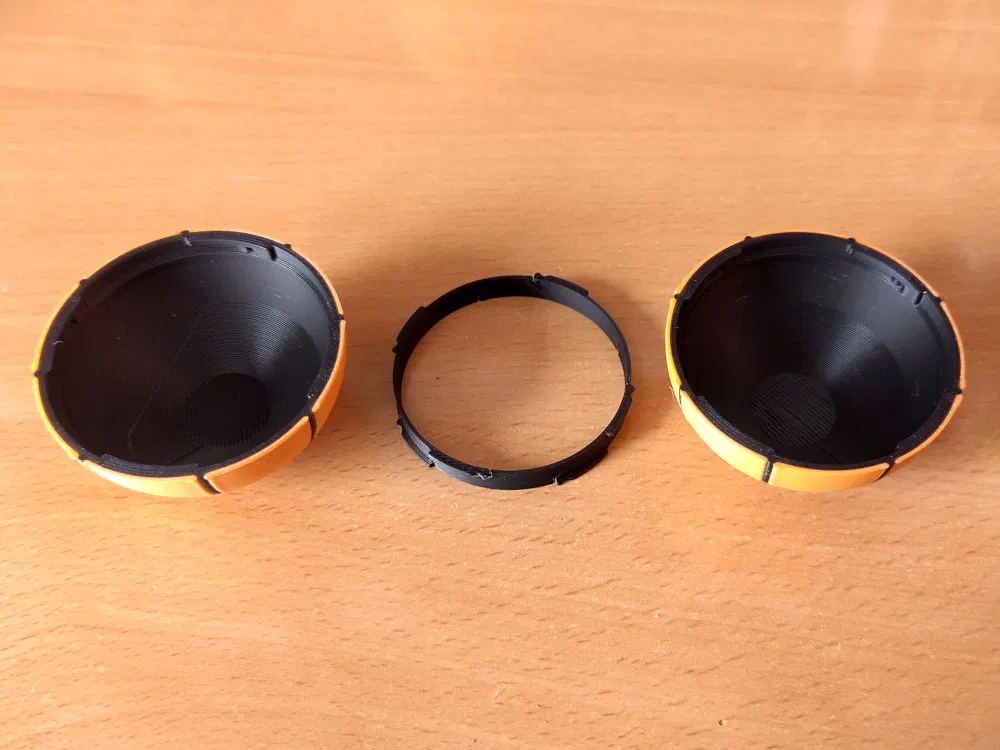 Mình muốn tạo ra một chiếc hộp hình cầu và đây là thành quả :) Hộp gồm hai nửa giống hệt nhau, được giữ chặt bằng một vòng khóa ngàm (bayonet lock) hai mặt. Tất nhiên là mình đã nghĩ ngay đến thiết kế quả bóng thể thao. Mình có làm một cuộc thăm dò trên hai nền tảng xem nên làm mẫu nào: kết quả nhận được 110 lượt bình chọn, chia đều một nửa cho bóng đá và một nửa cho bóng rổ, thế nên mình quyết định làm cả hai