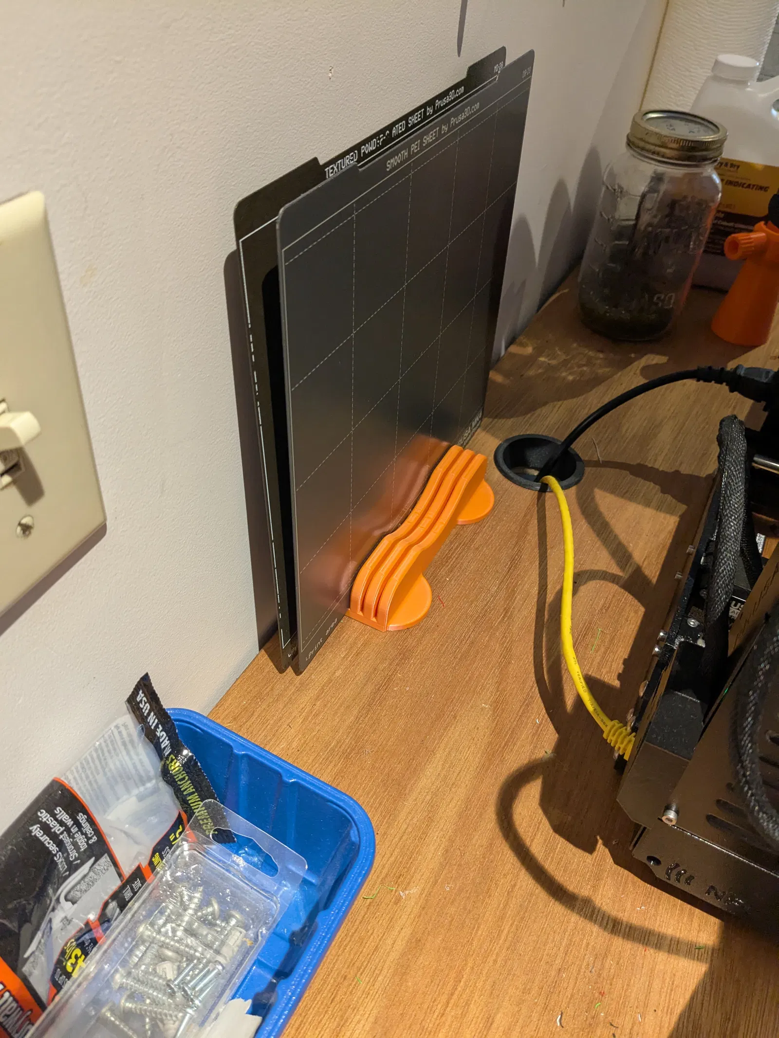 Mình cần một cái kệ để build plate vì đang muốn sắp xếp lại không gian làm việc. Để mấy cái build plate trên bàn hay trong hộc tủ chiếm diện tích quá, nên mình đã nhét nó ra phía sau máy in.