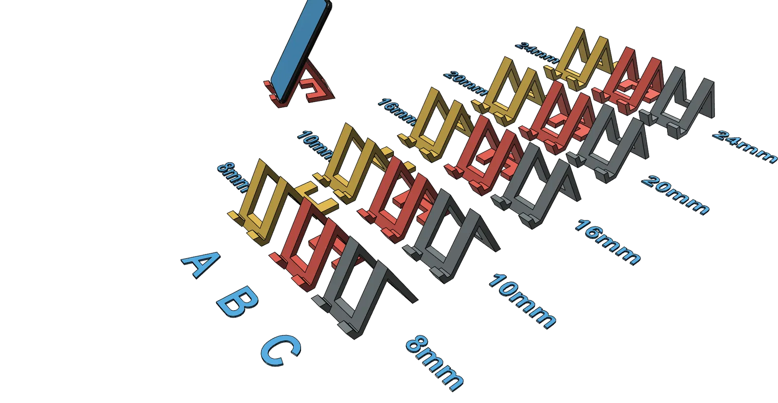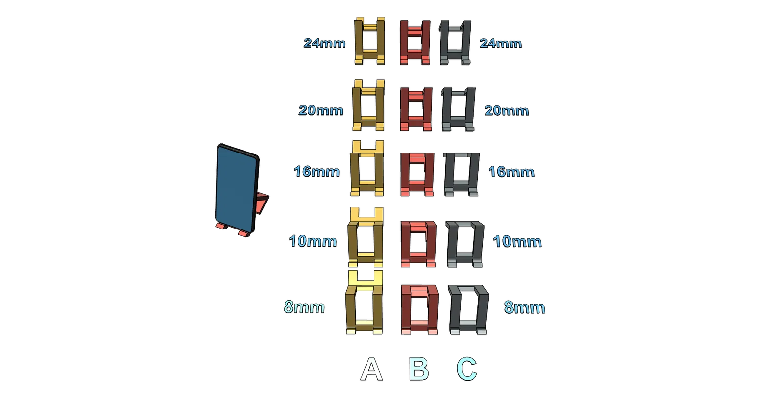 Điểm đặc biệt của thiết kế này là sự đa dạng về kích thước, đáp ứng mọi nhu cầu sử dụng của bạn. Dù điện thoại của bạn có dùng ốp lưng dày hay mỏng, bạn đều có thể lựa chọn phiên bản phù hợp nhất với độ sâu từ 8mm, 10mm, 16mm, 20mm cho đến 24mm. Việc in ấn cũng cực kỳ đơn giản và nhanh chóng, không yêu cầu bất kỳ cấu trúc hỗ trợ (support) nào, giúp tiết kiệm thời liệu và rút ngắn thời gian xử lý hậu kỳ cho người mới bắt đầu in 3D.