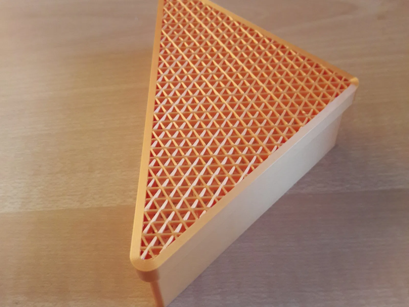 Tôi đã in nó mà không có lớp đầu tiên hoặc lớp cuối cùng để xem phần bên trong (35% hình tam giác) bằng PLA lụa vàng và PLA trắng cho các phần đơn lẻ.