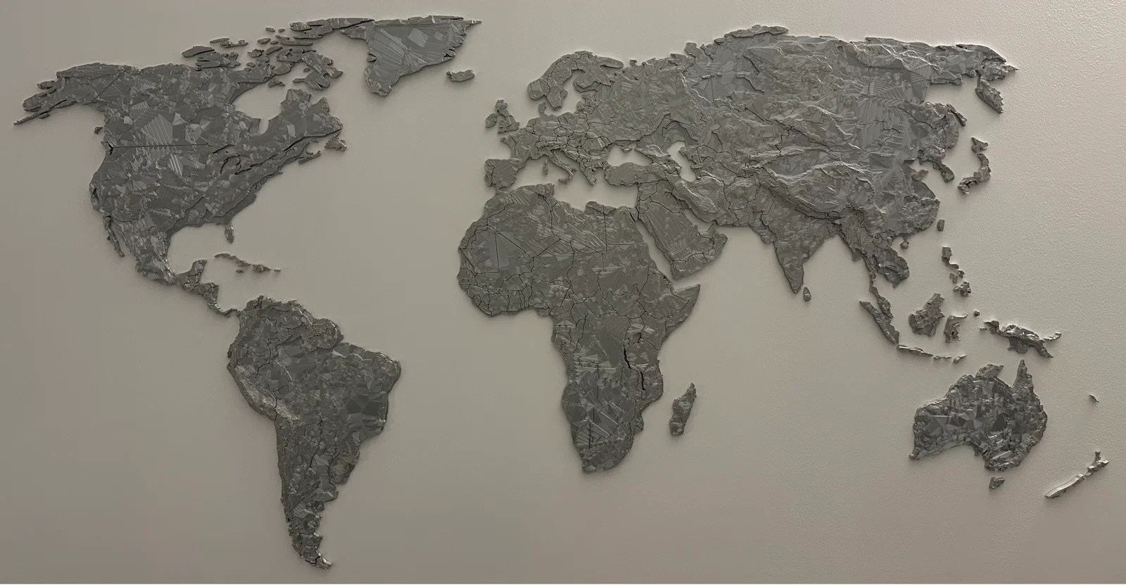Bản đồ thế giới (phép chiếu Robinson) với độ cao tương đối, kích thước hoàn thiện khoảng 1,5m. Mô hình được tối ưu cho bàn in 25x21cm, không cần support, phù hợp cho những ai muốn trang trí tường nhà bằng bản đồ địa hình độc đáo.
