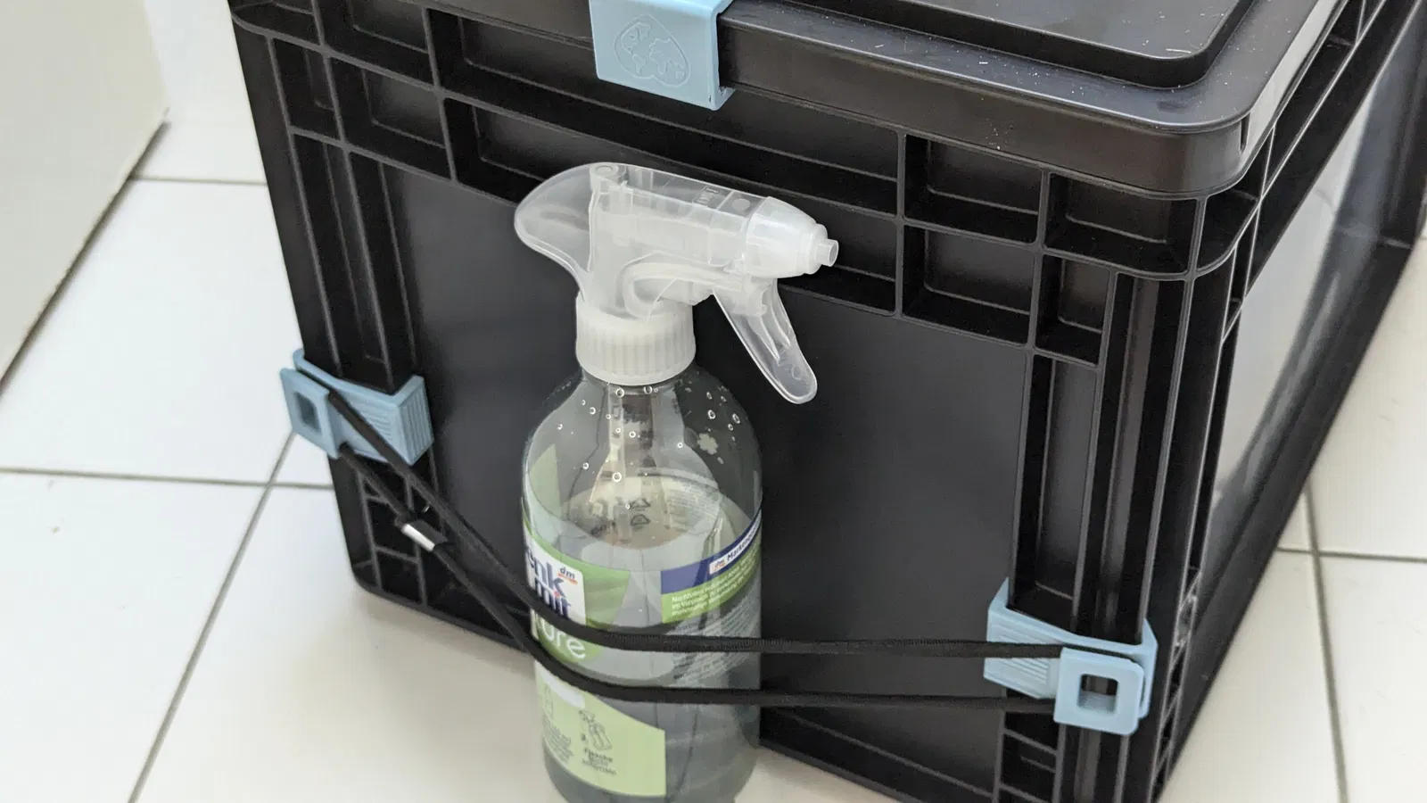Mình đã thiết kế bộ kẹp tháo lắp được để gắn bình xịt nước lên cái nhà vệ sinh khô di động Trobolo của mình. Bạn có thể dùng nó cho bất kỳ thùng Auer Eurobox nào. Phía sau kẹp có một phần hình nón để cố định vào các gờ dọc của thùng. Rất dễ gắn vào hay tháo ra khi cần vận chuyển, và quan trọng là không làm ảnh hưởng đến kích thước chuẩn của thùng khi xếp chồng lên nhau.