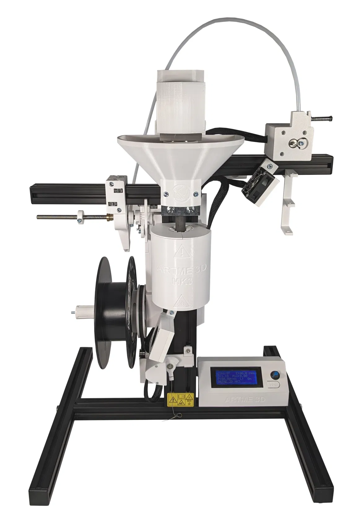 MK3 là máy đùn nhựa có thiết kế nhỏ gọn nhưng mạnh mẽ, dùng để sản xuất sợi nhựa in 3D với đường kính 1.75mm và 2.85mm. Máy sử dụng trục vít đùn bằng thép không gỉ có vùng nén, cho phép xử lý các loại hạt nhựa thương mại cũng như nhựa tái chế từ phế phẩm in 3D. Sợi nhựa thành phẩm được quấn trực tiếp vào cuộn, tất cả gói gọn trong không gian chỉ rộng 486 mm và sâu 406 mm.