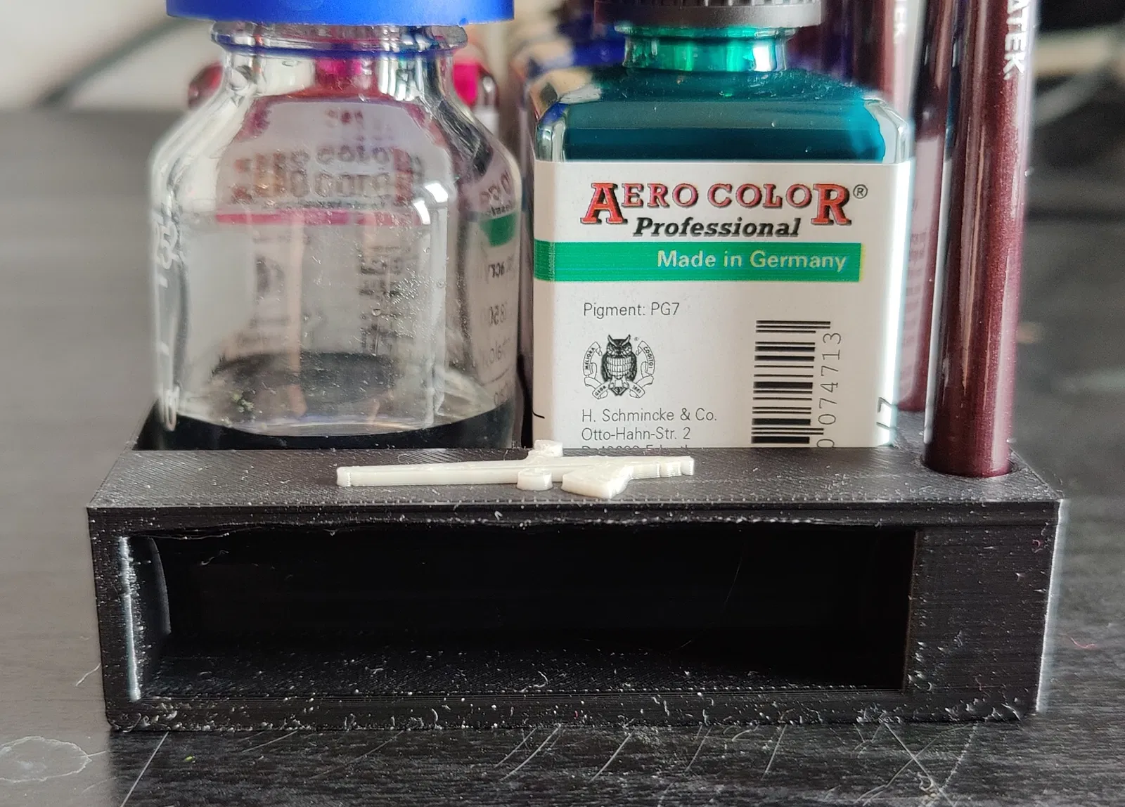 Chào mọi người, mình muốn có một chiếc kệ gọn gàng, tinh tế để sắp xếp các lọ màu Airbrush của Schmincke (https://www.amazon.de/gp/product/B0012F82P2/ref=ppx_yo_dt_b_asin_title_o04_s00?ie=UTF8&psc=1). Mình cũng đã bổ sung thêm mười lỗ ở mặt sau để cắm cọ với đường kính tối đa 8mm. Thiết kế có hai phiên bản: một bản có khắc chữ "Airbrush" kèm biểu tượng và một bản trơn không chữ. ##### Hướng dẫn in Cần dùng support cho phần tay cầm ở hai bên trái và phải. Mình in với độ dày lớp (layer height) 0.3mm bằng nhựa PLA (bạn cũng có thể dùng PETG, dù mình chưa thử nghiệm). Để in chữ và biểu tượng với màu khác, mình chỉ cần thiết lập tính năng đổi màu (color change) tại độ cao mong muốn trong PrusaSlicer.