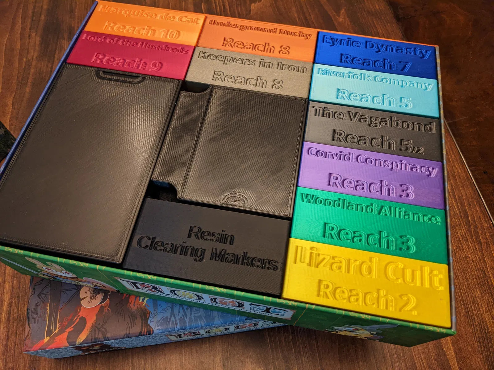 - Vagabond có các khay chia nhỏ cho token vì có quá nhiều loại, còn Riverfolk có khay bài nam châm cho khu chợ (sử dụng nam châm 3mmx6mm gắn khi in).