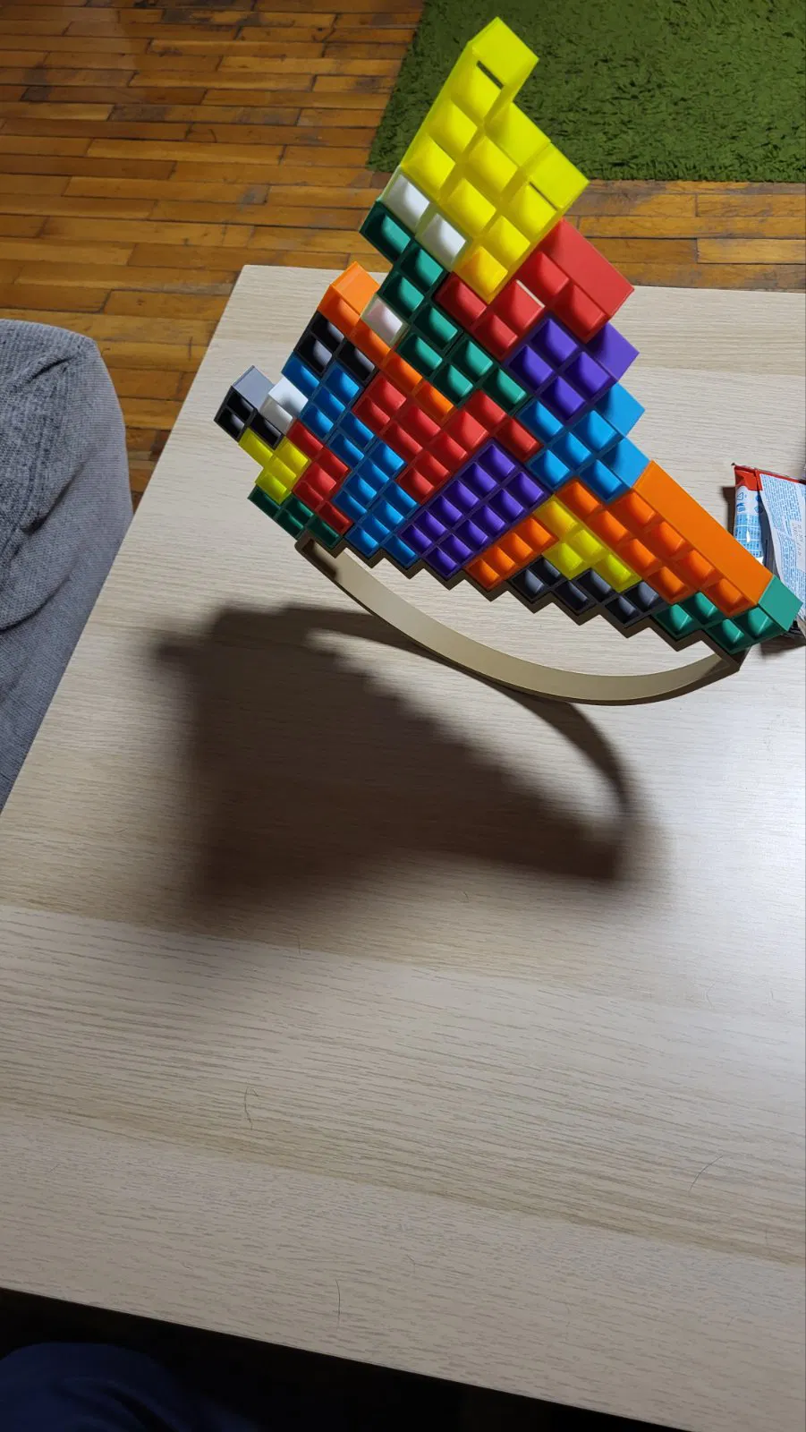 Tôi đã tạo ra một phiên bản kích thước lớn của trò chơi xếp hình cân bằng Tetris. Có 2 kích thước cho phần đế và 11 mảnh ghép khác nhau. (Sau này tôi mới nhận ra là bị thiếu mảnh chữ T lớn). Hiện tại đang sử dụng 4 mảnh cho mỗi loại.