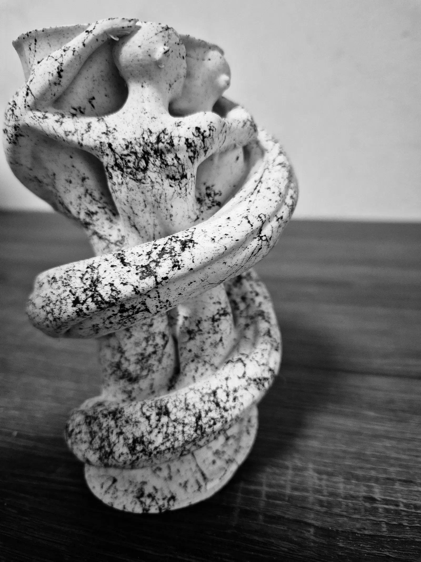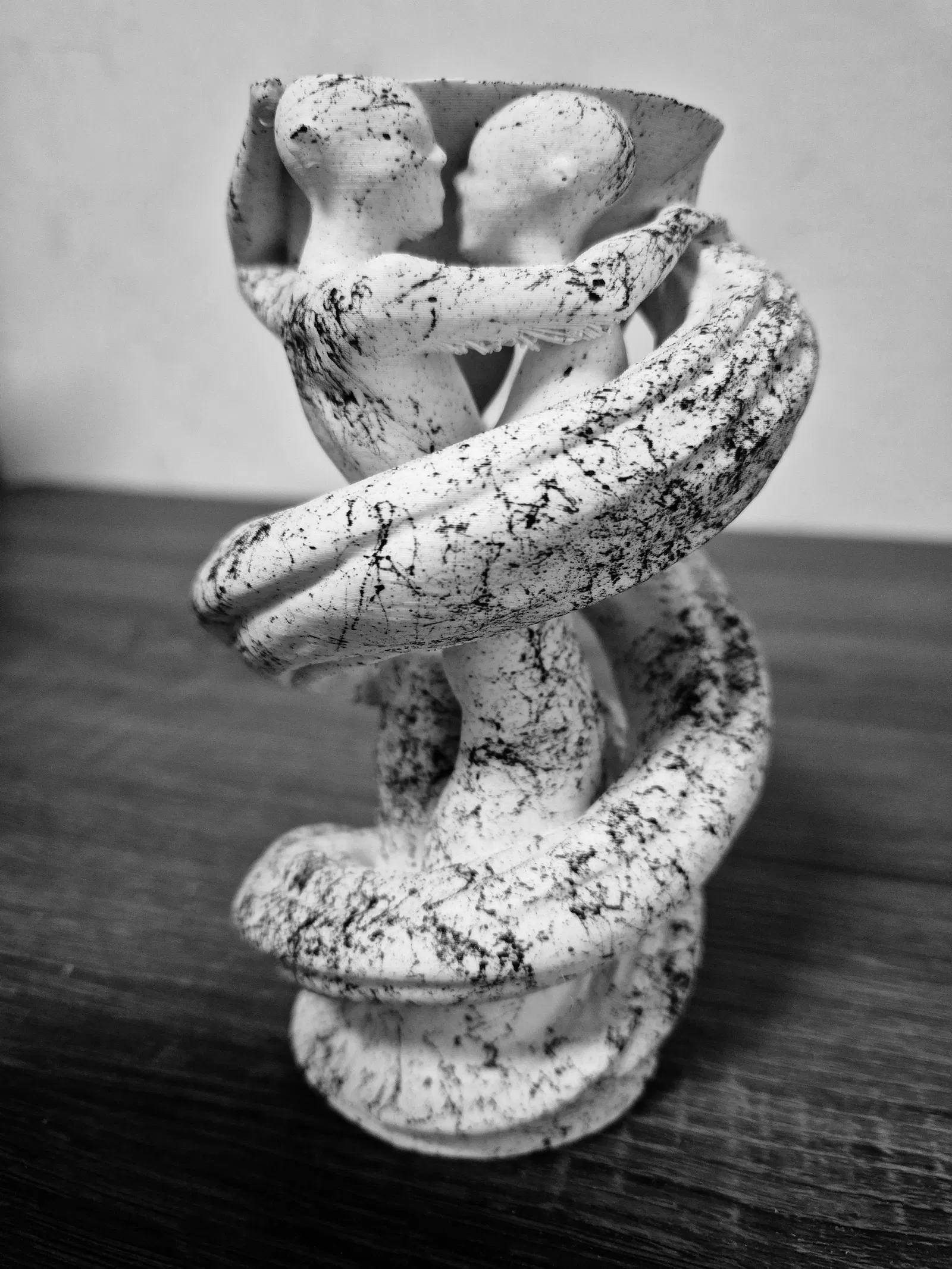 Ban đầu mình định thiết kế làm bình hoa nhưng tiếc là kết quả không được như ý, nhưng họa tiết lại khá đẹp nên mình chuyển nó thành tác phẩm điêu khắc luôn. Về lý thuyết thì các bạn có thể in không cần support, nhưng nếu dùng support thì các đường cong sẽ mượt và đẹp hơn nhiều. Trong ảnh là sản phẩm in bằng nhựa PLA trắng, sau đó được xịt thêm lớp sơn phủ vân đá đen. Thiết lập in: 2 tường (walls), 10% infill, thời gian in khoảng 3 tiếng.