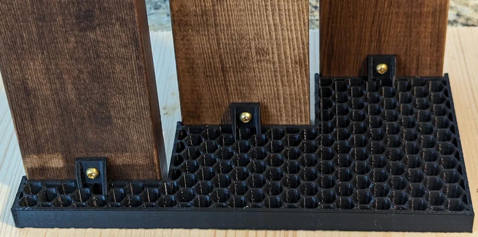 Các phần giá đỡ in rất dễ, không cần hỗ trợ (supports). Mình in bằng nhựa PLA màu đen nhám (matte black). Ngoài các linh kiện in 3D, bạn cần chuẩn bị gỗ 1" x 3" (khoảng 20mm x 64mm) cắt thành ba đoạn bằng nhau tùy theo ý muốn và sáu con vít gỗ cỡ #6 (3.5mm) có chiều dài ngắn hơn độ dày của ván gỗ.