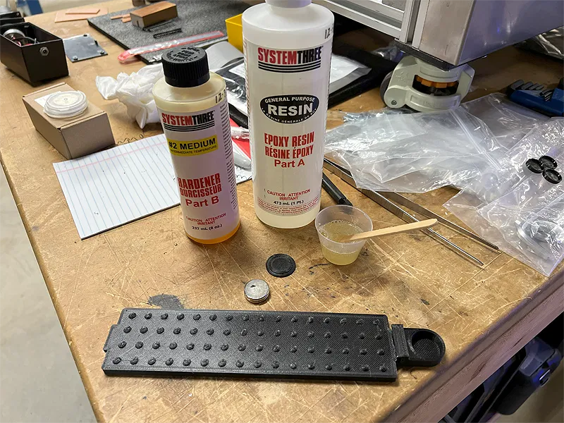 Chồng 2 viên nam châm (20x3mm) vào hốc. Lưu ý canh cực Bắc/Nam của nam châm sao cho khớp với nam châm đặt bên ngoài hồ cá. Đánh dấu nam châm bằng bút lông sẽ giúp giữ đúng chiều khi cố định bằng keo epoxy. Hãy dùng keo epoxy 2 thành phần để bịt kín và dán cố định nam châm.