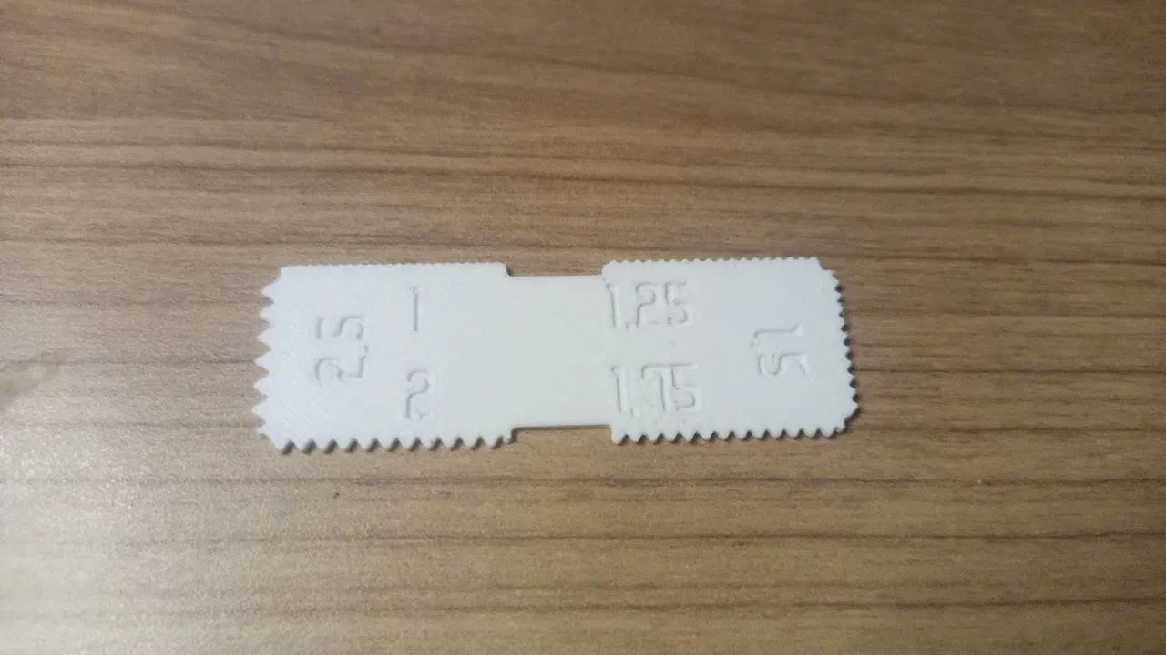 Bộ dưỡng đơn giản giúp đo nhanh và chính xác các bước ren hệ mét thông dụng từ 1 đến 2.5. Thiết kế nhỏ gọn, in nhanh bằng nhựa PLA, cực kỳ tiện lợi để mang theo bên mình hoặc cất trong ví.