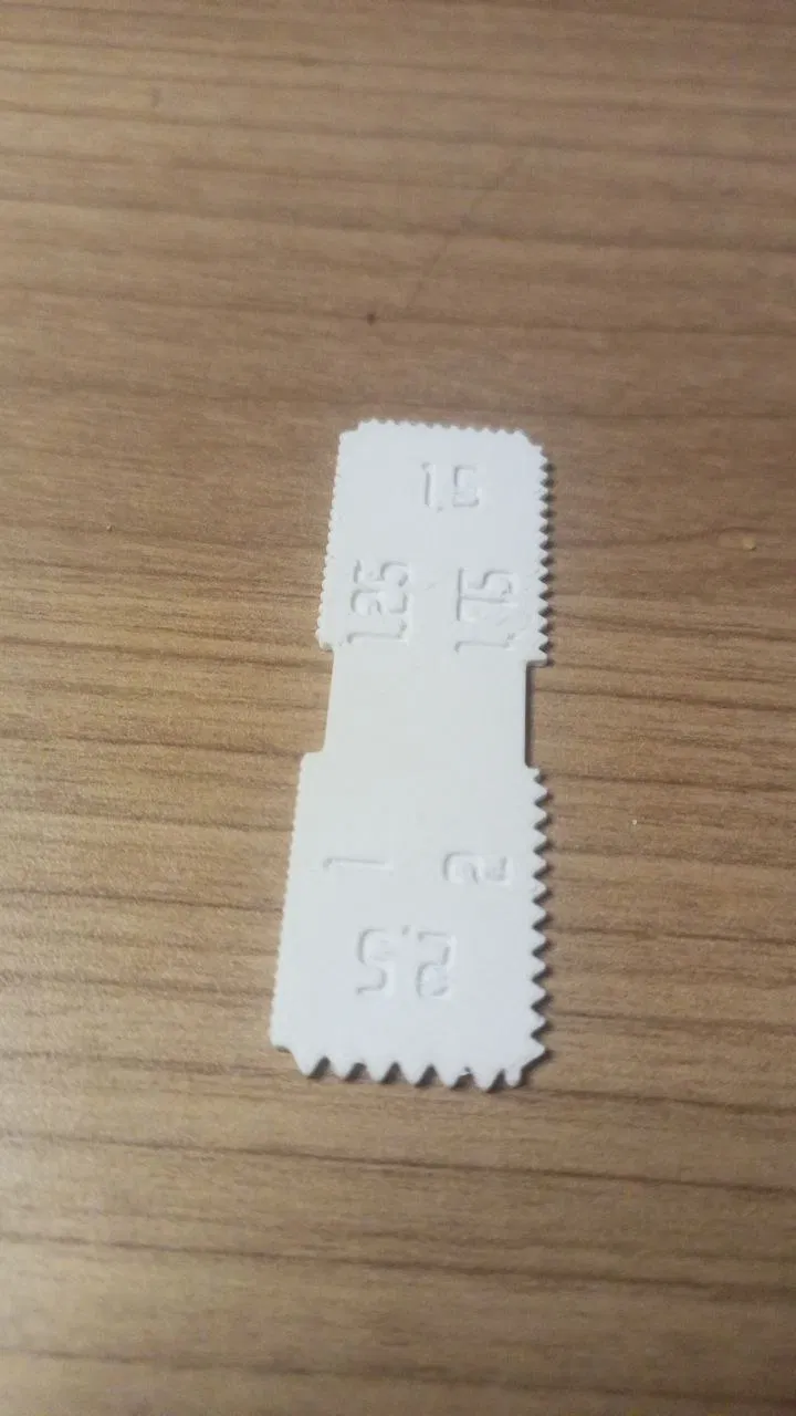 Cái dưỡng đơn giản này giúp bạn đo bước ren hệ mét thông dụng một cách nhanh chóng và chính xác. Thời gian in chỉ mất vài phút. Các cái dưỡng này rất nhỏ gọn, bạn có thể dễ dàng mang theo bên mình mọi lúc, ví dụ như để trong ví.