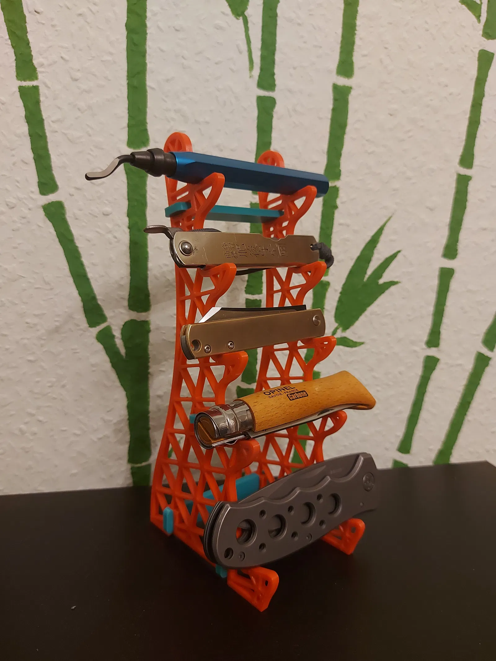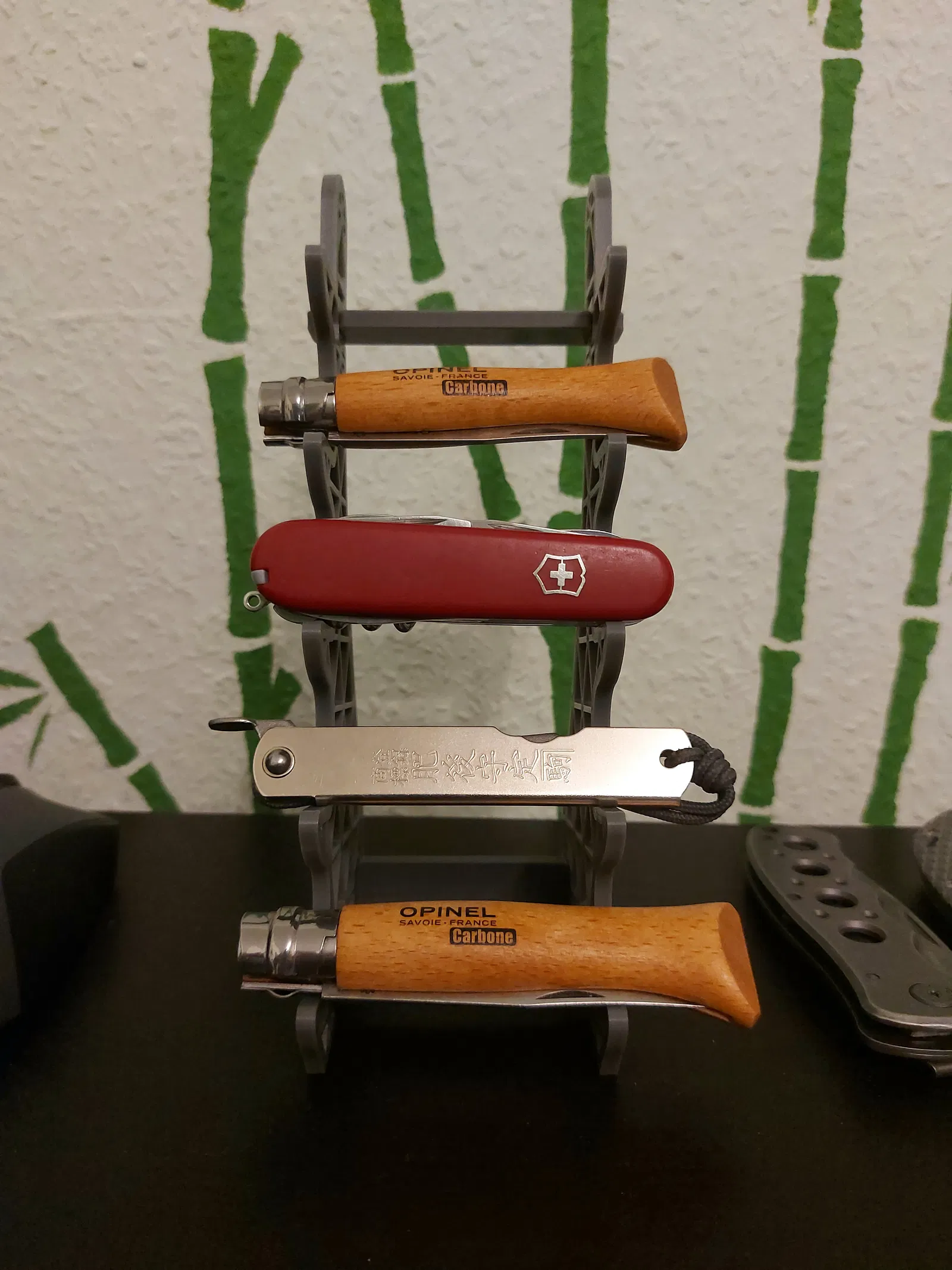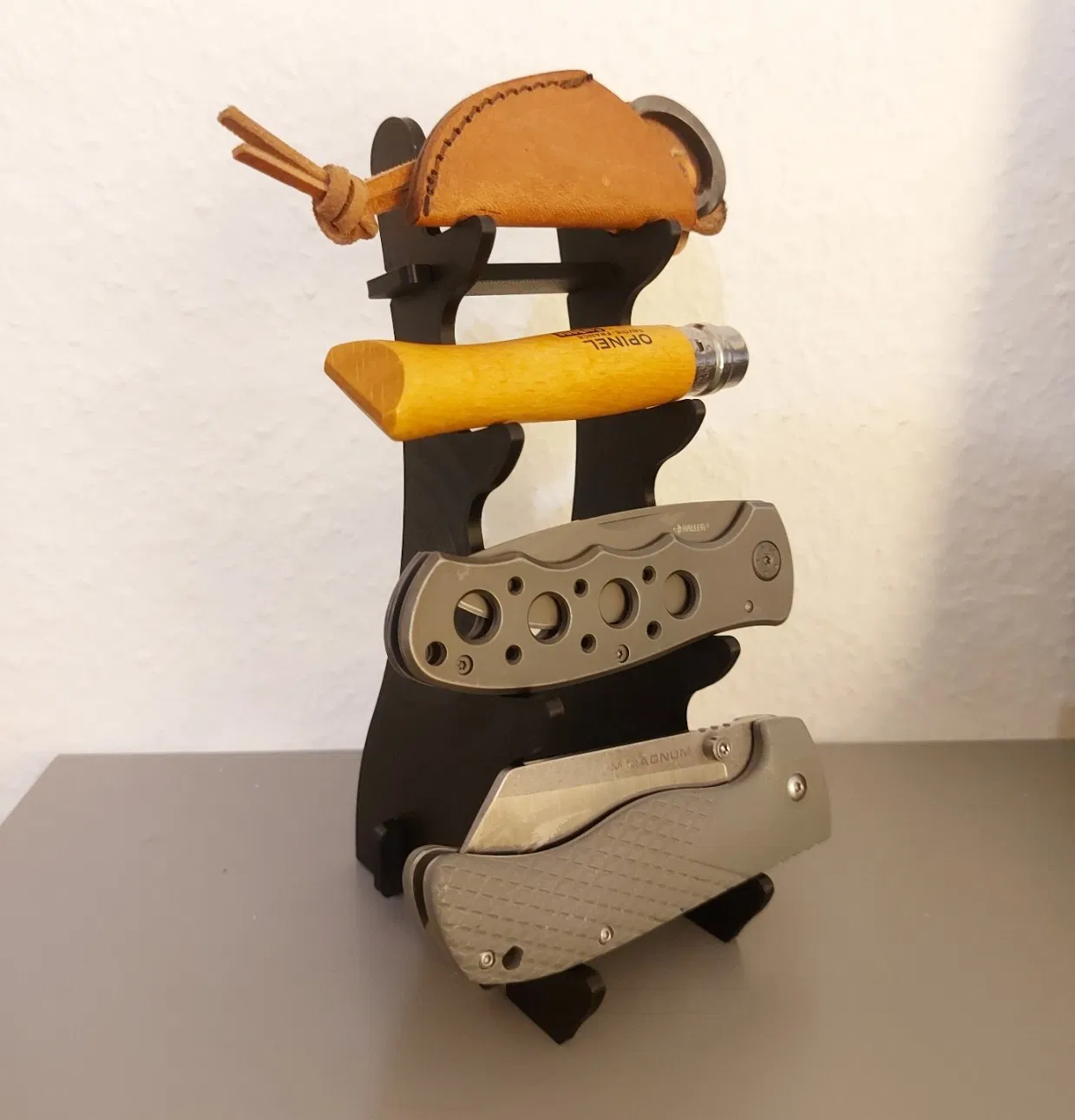 Kệ trưng bày dao đứng cực kỳ tiện lợi cho 4-5 con dao bỏ túi như Opinel hay Victorinox. Thiết kế lắp ráp kiểu nhấn khớp chắc chắn, dễ in, cho phép tùy chỉnh cấu hình kệ và độ rộng để phù hợp với nhiều loại dao khác nhau trong bộ sưu tập của bạn.