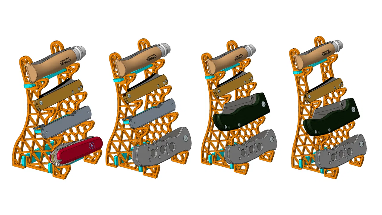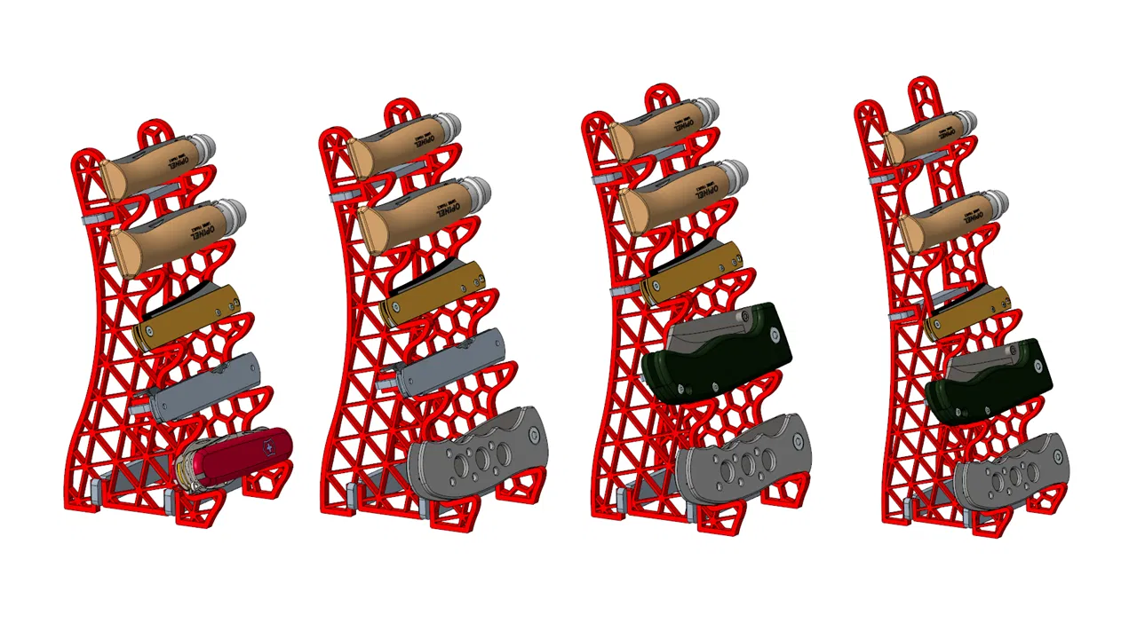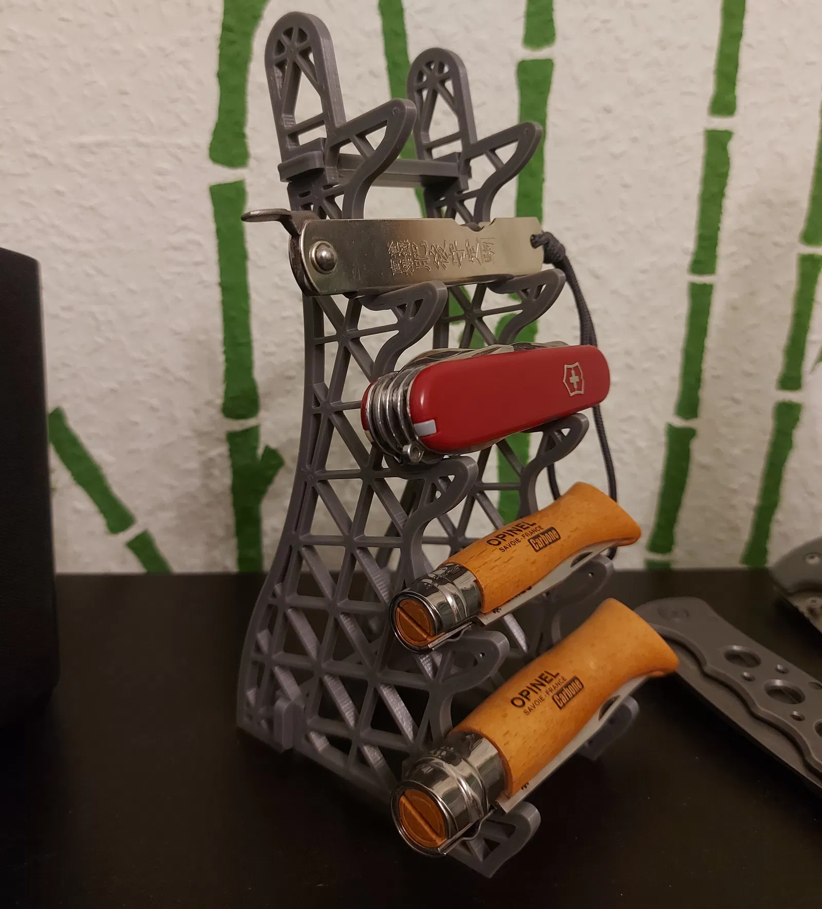 Kệ trưng bày dao đứng cực kỳ tiện lợi cho 4-5 con dao bỏ túi như Opinel hay Victorinox. Thiết kế lắp ráp kiểu nhấn khớp chắc chắn, dễ in, cho phép tùy chỉnh cấu hình kệ và độ rộng để phù hợp với nhiều loại dao khác nhau trong bộ sưu tập của bạn.