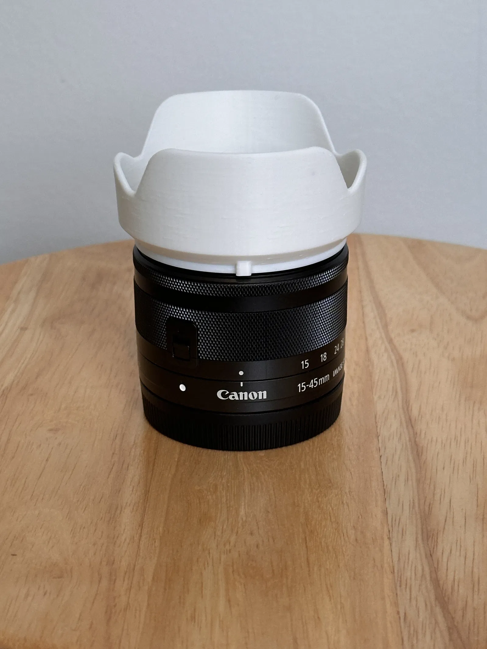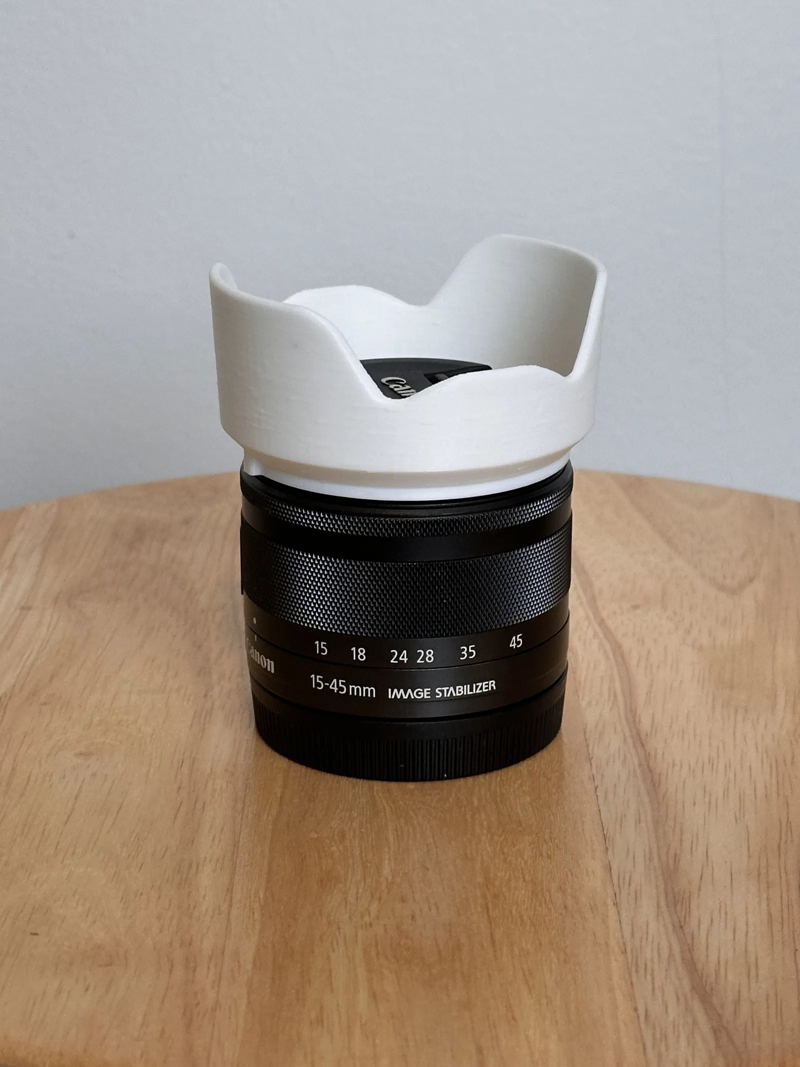 Cái loa che nắng (lens hood) này được thiết kế để lắp vừa vặn cho ống kính Canon 15-45mm ngàm EF-M, chẳng hạn như trên máy Canon M50. Mình đã kiểm tra kỹ để đảm bảo rằng loa che không làm ảnh hưởng đến chất lượng hình ảnh hoặc gây ra hiện tượng tối góc (vignette). Nó có thể gắn khớp vào ống kính một cách chắc chắn.