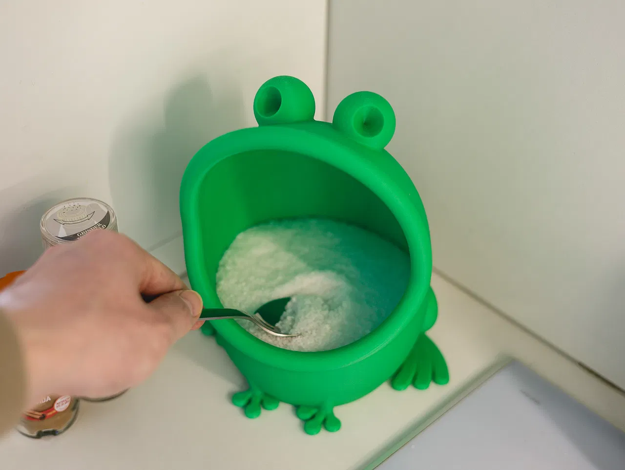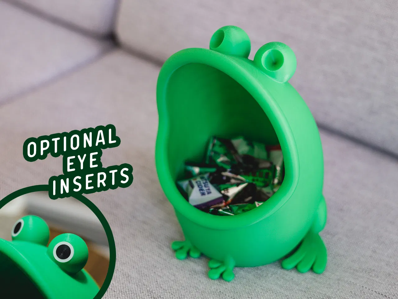Đây là một chiếc hộp đựng đồ có hình dáng một chú ếch đang ngồi với cái miệng mở to. Bạn có thể đựng bất cứ thứ gì trong này, miễn là không cần phải đậy nắp. Từ kẹo bánh, các bản in 3D lỗi, văn phòng phẩm - đủ thứ cả! Bạn thậm chí có thể dùng nó làm "hũ đựng muối" (một loại vật dụng nhà bếp để đựng muối), nhưng chắc là phải gọi là "ếch đựng muối" mới đúng. Chỉ là đừng bỏ rác vào nhé - chú ếch này xứng đáng được đối xử tốt hơn thế.