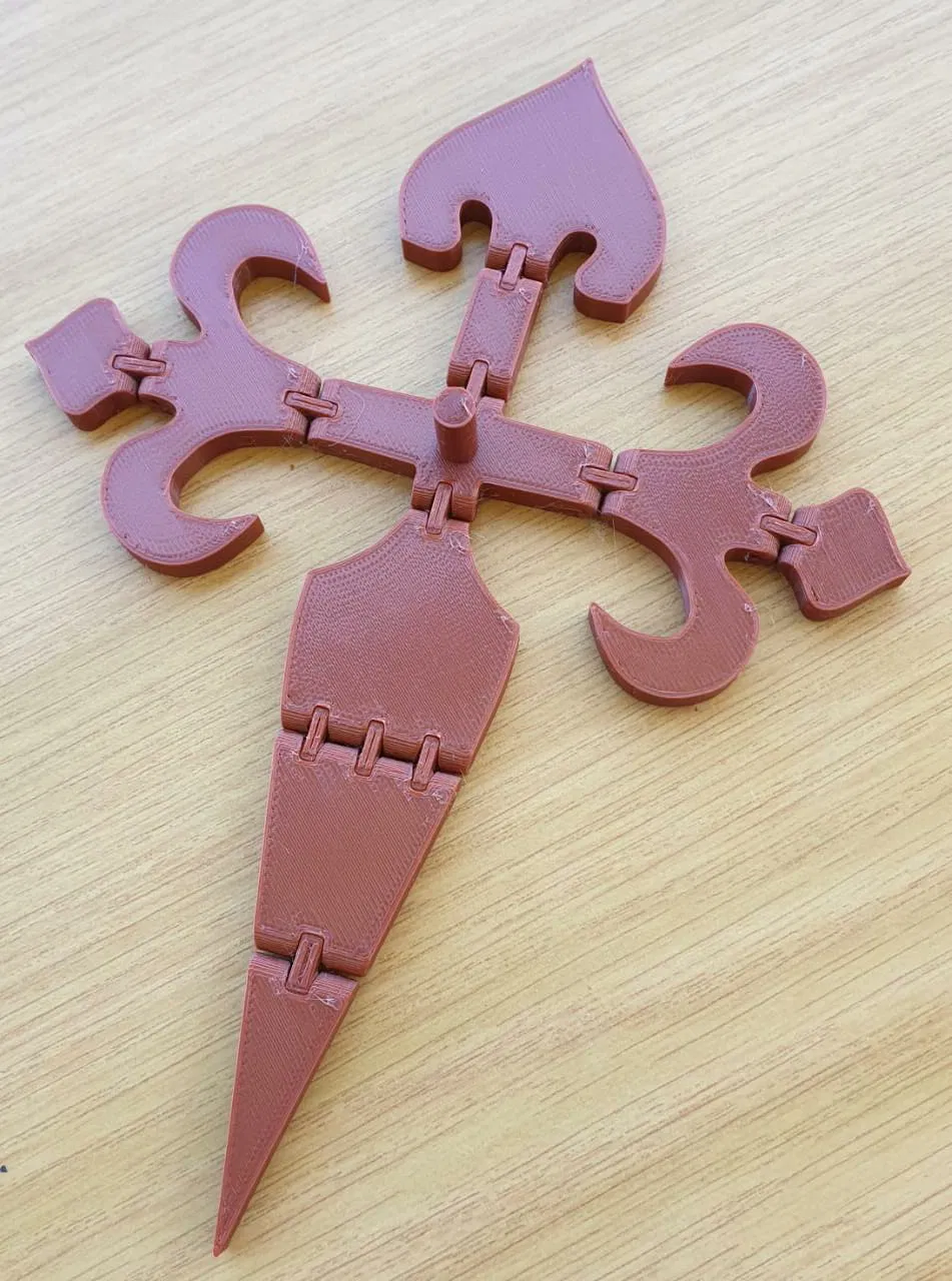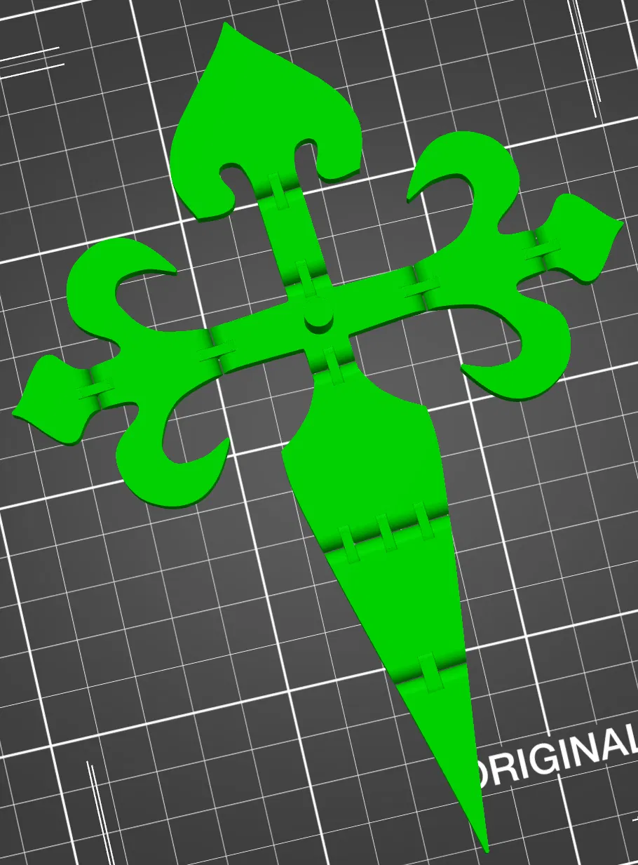 Khuôn in 3D với thiết kế khớp nối linh hoạt, giúp bạn dễ dàng rắc đường bột tạo hình Thập tự Santiago trên bề mặt bánh Tarta de Santiago dù bánh không phẳng. Sản phẩm in liền khối, không cần hỗ trợ, giúp việc trang trí bánh trở nên chuyên nghiệp và dễ dàng hơn bao giờ hết.