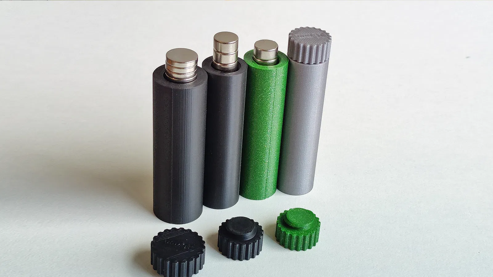 Mẫu hộp lưu trữ này được thiết kế dành riêng cho các loại nam châm tròn. Trên nắp vặn có ghi rõ đường kính tương ứng. Mẹo nhỏ: nếu bạn đặt viên nam châm đầu tiên ngược chiều vào trong ống, các viên nam châm còn lại sẽ hơi đẩy ra ngoài, giúp dễ lấy hơn. Các file in được thiết kế cho loại đường kính 10, 12 và 15 mm. Ngoài ra còn có file FreeCAD tham số để bạn có thể tùy chỉnh đường kính, chiều dài ống và nội dung chữ trên nắp.