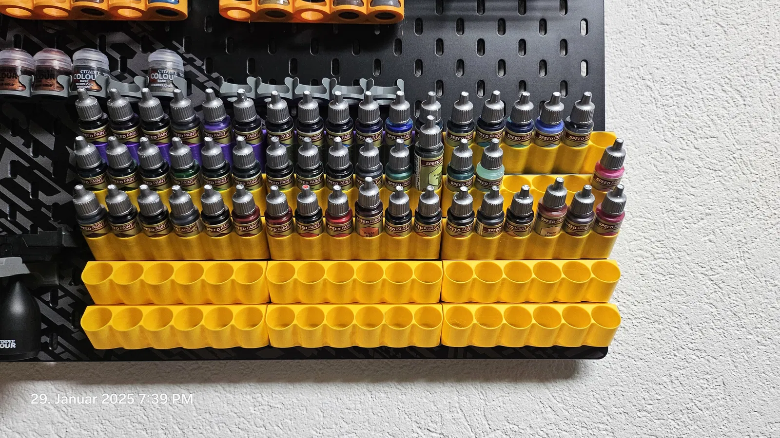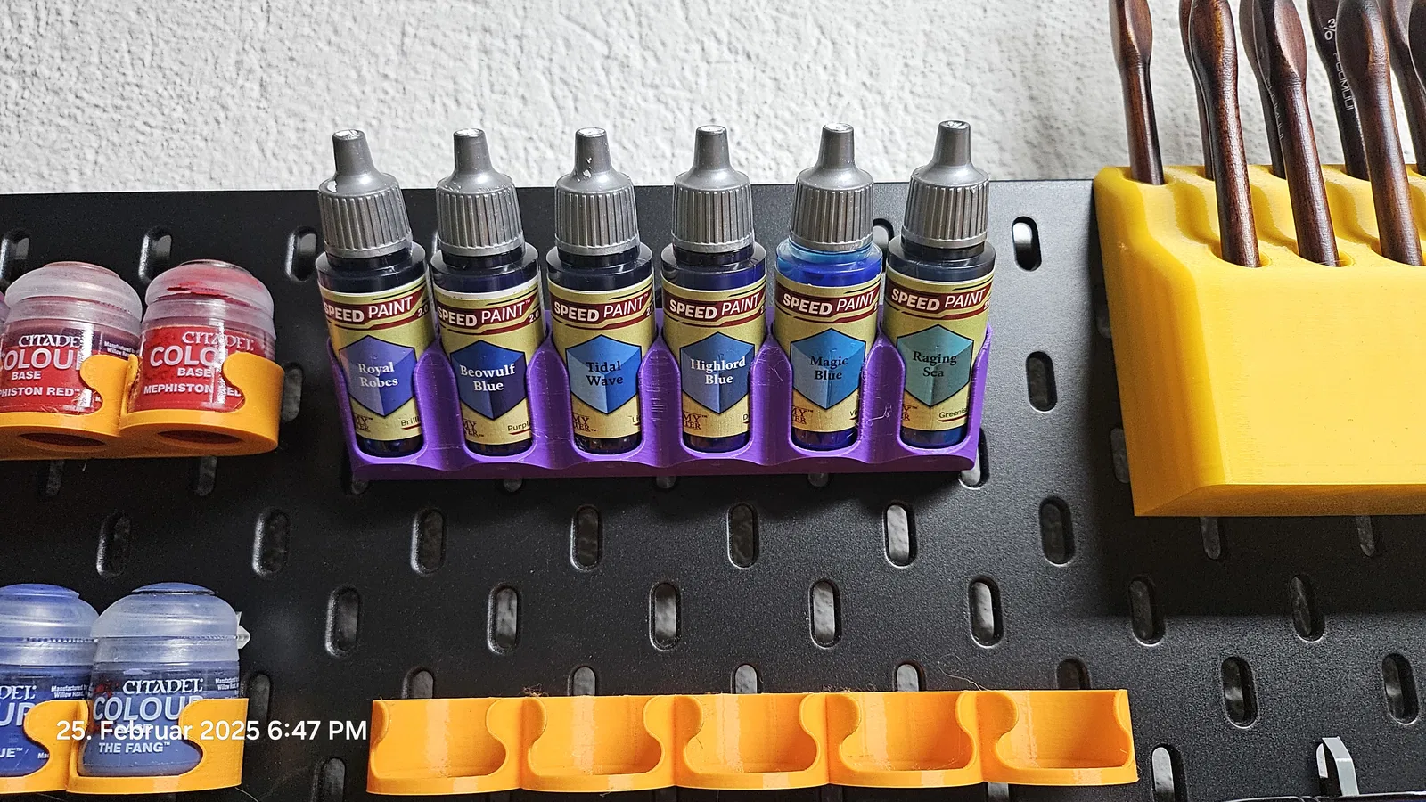 Giá đỡ tiện lợi cho 6 chai sơn Army Painter trên bảng Skadis. Thiết kế tối ưu không gian, dễ dàng mở rộng. Đã cập nhật phiên bản lỗ cắm rộng hơn và kiểu mặt hở để dễ đọc tên màu sơn.