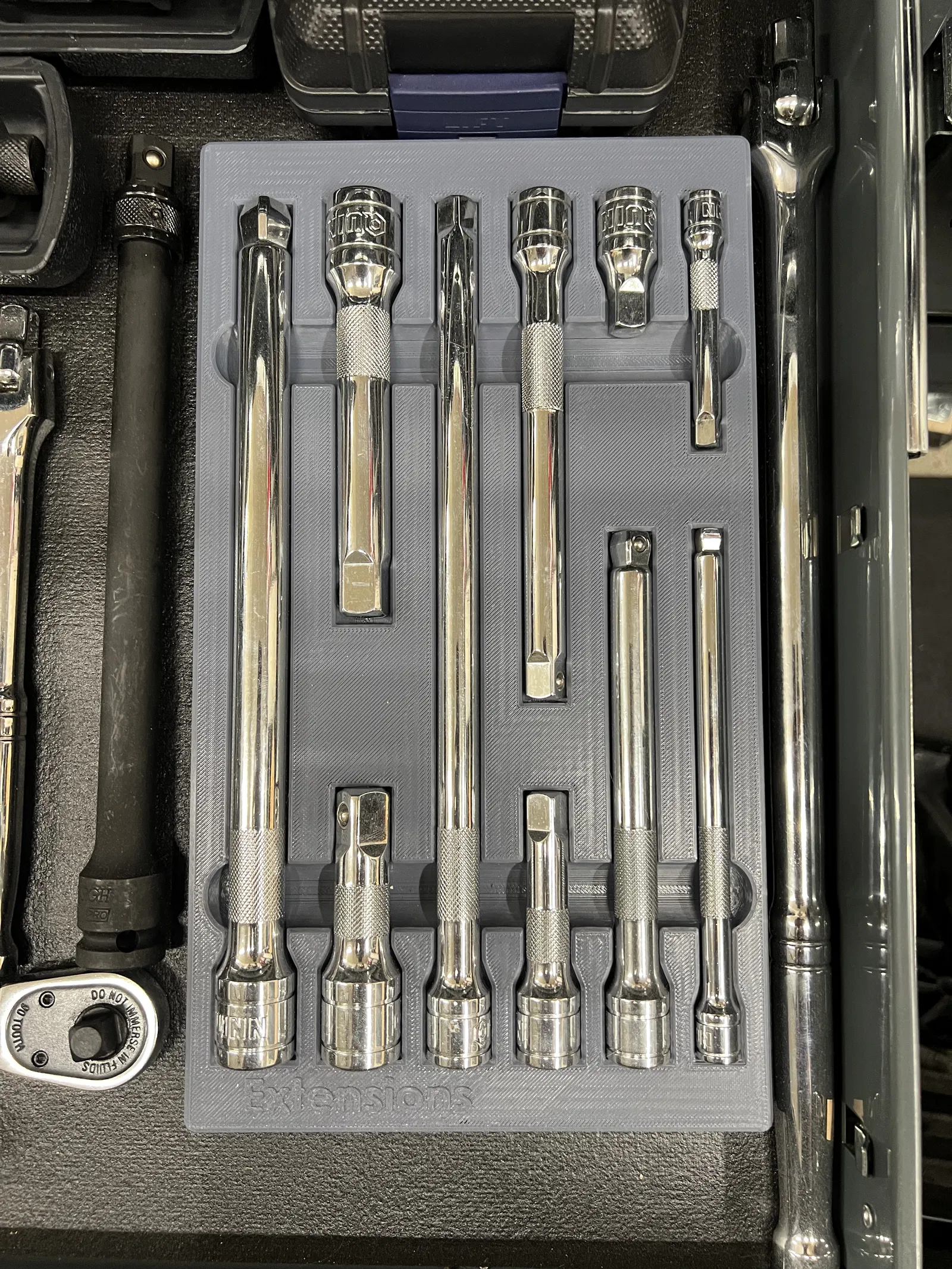Được thiết kế tỉ mỉ để tương thích hoàn hảo với các kích thước tiêu chuẩn của bộ Quinn, mỗi khay in 3D đều có các hốc chứa riêng biệt cho từng món. Bạn có thể dễ dàng phân loại theo hệ inch hoặc hệ mét, giúp việc tìm kiếm kích thước cần thiết trở nên nhanh chóng hơn bao giờ hết. Sự kết hợp giữa các khay màu xanh, cam và xám không chỉ tạo điểm nhấn thẩm mỹ cho bàn làm việc mà còn giúp bạn phân biệt nhanh chóng các nhóm công cụ khác nhau chỉ bằng một cái nhìn thoáng qua.