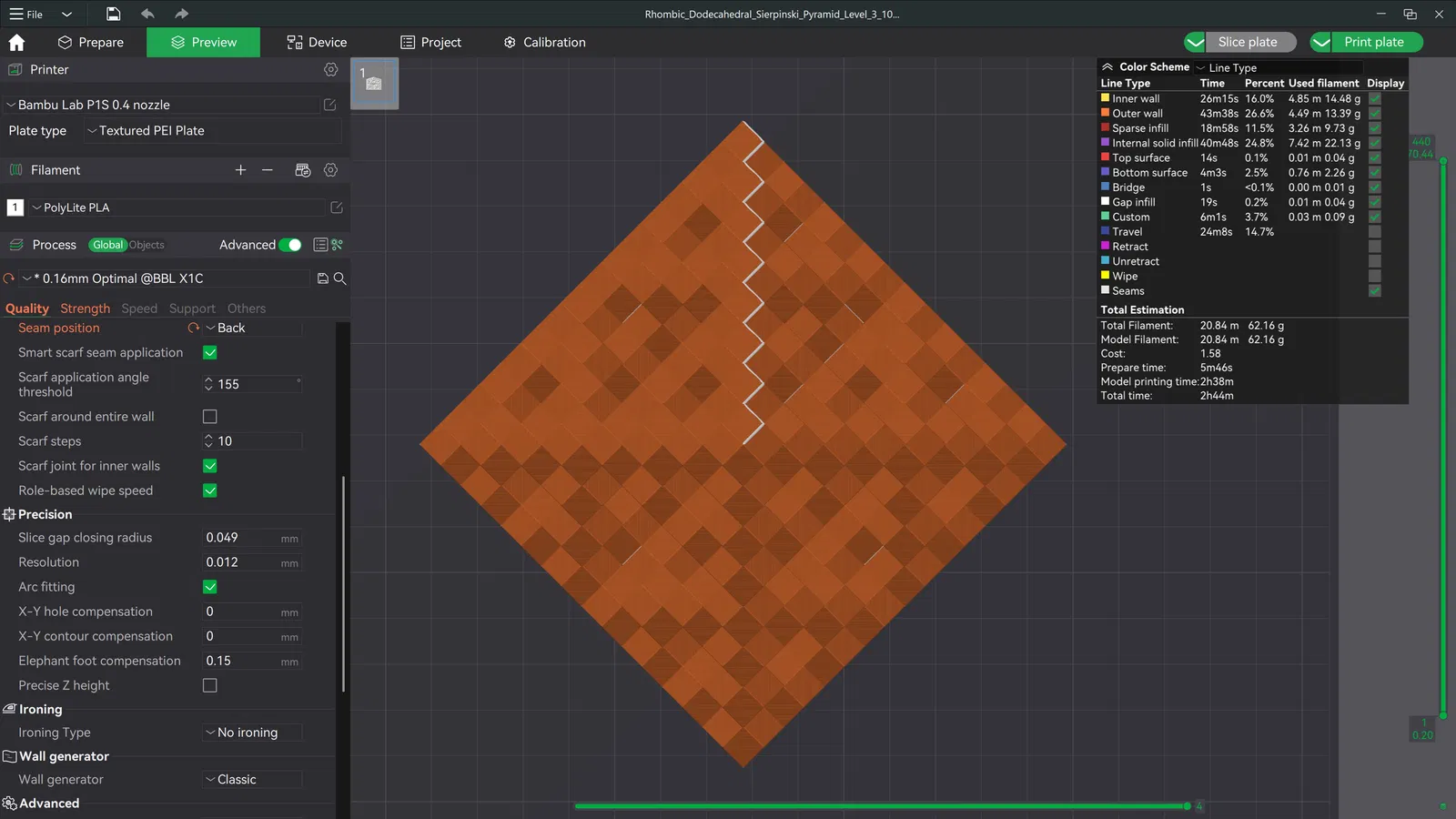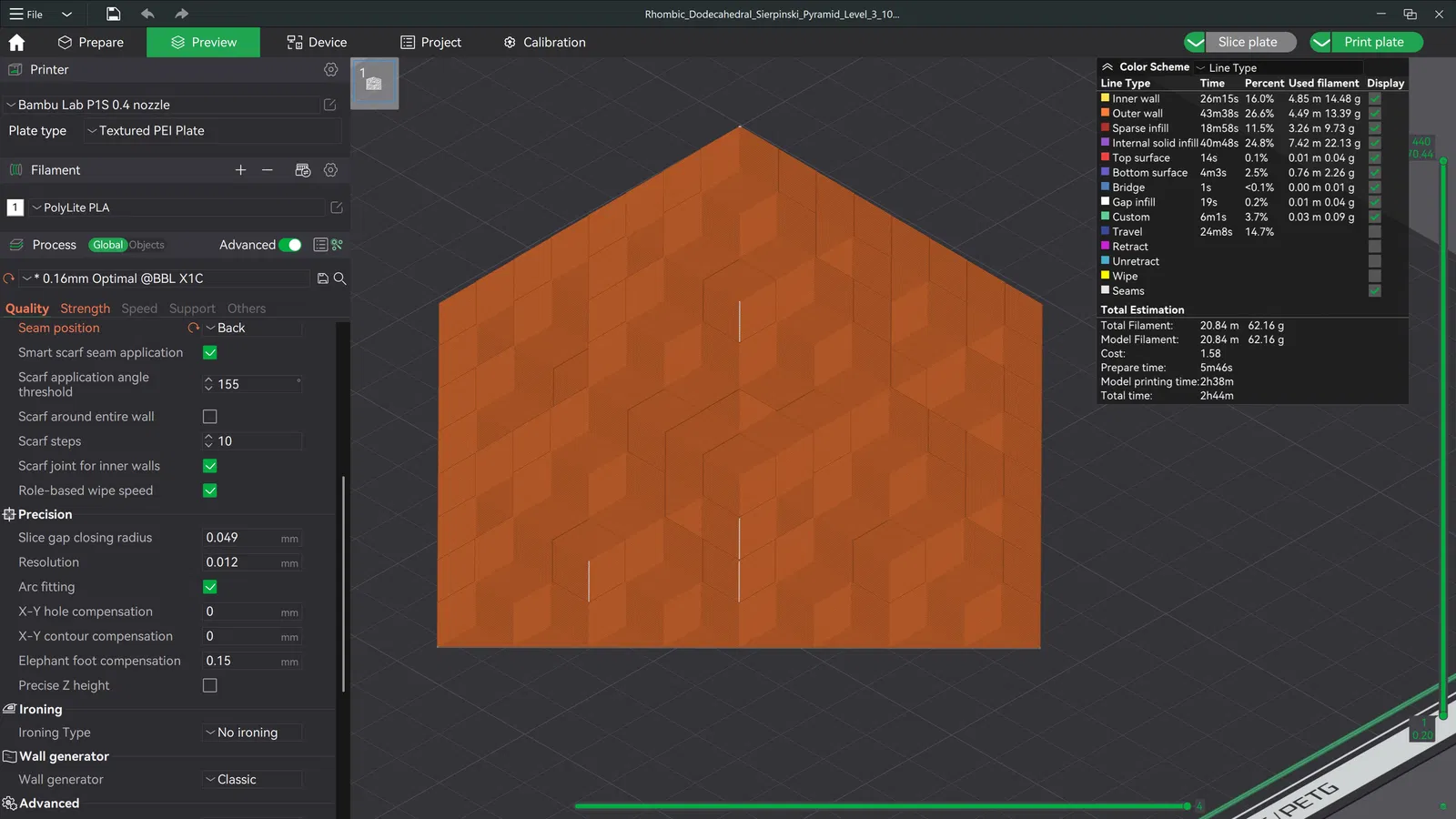 Mẫu này là cấu trúc fractal Kim tự tháp Sierpiński Cấp độ 3 được tạo nên từ các khối Rhombic Dodecahedra (khối 12 mặt thoi). Nhìn cực kỳ ấn tượng và in rất đẹp mà không cần hỗ trợ (support)! 😁 Mình có đính kèm file 3MF để bạn in ra sản phẩm y hệt như trong hình. Dưới đây là thiết lập mình đã dùng: Layer Height: 0.16mm Infill: Tùy chọn (mình dùng Gyroid, 5%) Supports: Không cần Seam Position: Phía sau Nếu bạn gặp vấn đề gì, đừng ngần ngại nhắn cho mình nhé. Mình luôn sẵn lòng hỗ trợ! Chúc các bạn in ấn vui vẻ! 🥳 Thông tin bản quyền: Mẫu này được cấp phép theo Creative Commons Attribution-NonCommercial-NoDerivatives (CC BY-NC-ND). Bạn có thể chia sẻ, sao chép và phân phối lại file này cho mục đích phi thương mại kèm theo ghi chú nguồn gốc. Tuy nhiên, bạn không được phép chỉnh sửa hoặc tạo ra các tác phẩm phái sinh từ mẫu này. Nghiêm cấm bán mẫu này dưới dạng kỹ thuật số hoặc vật phẩm in thực tế. ***Việc bán các sản phẩm in thực tế từ thiết kế của mình chỉ được phép nếu bạn là thành viên đang hoạt động trong gói Authorized Seller trên Patreon, Printables hoặc MakerWorld.