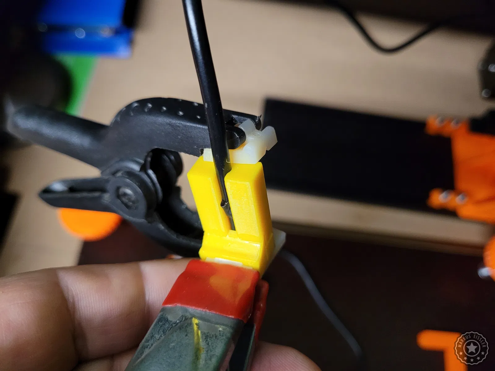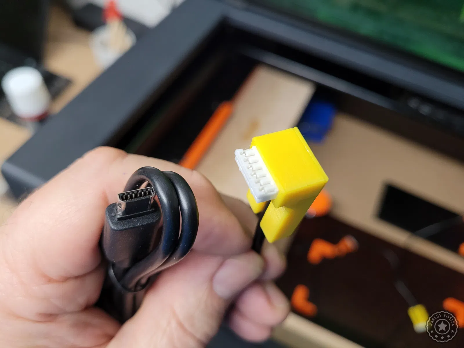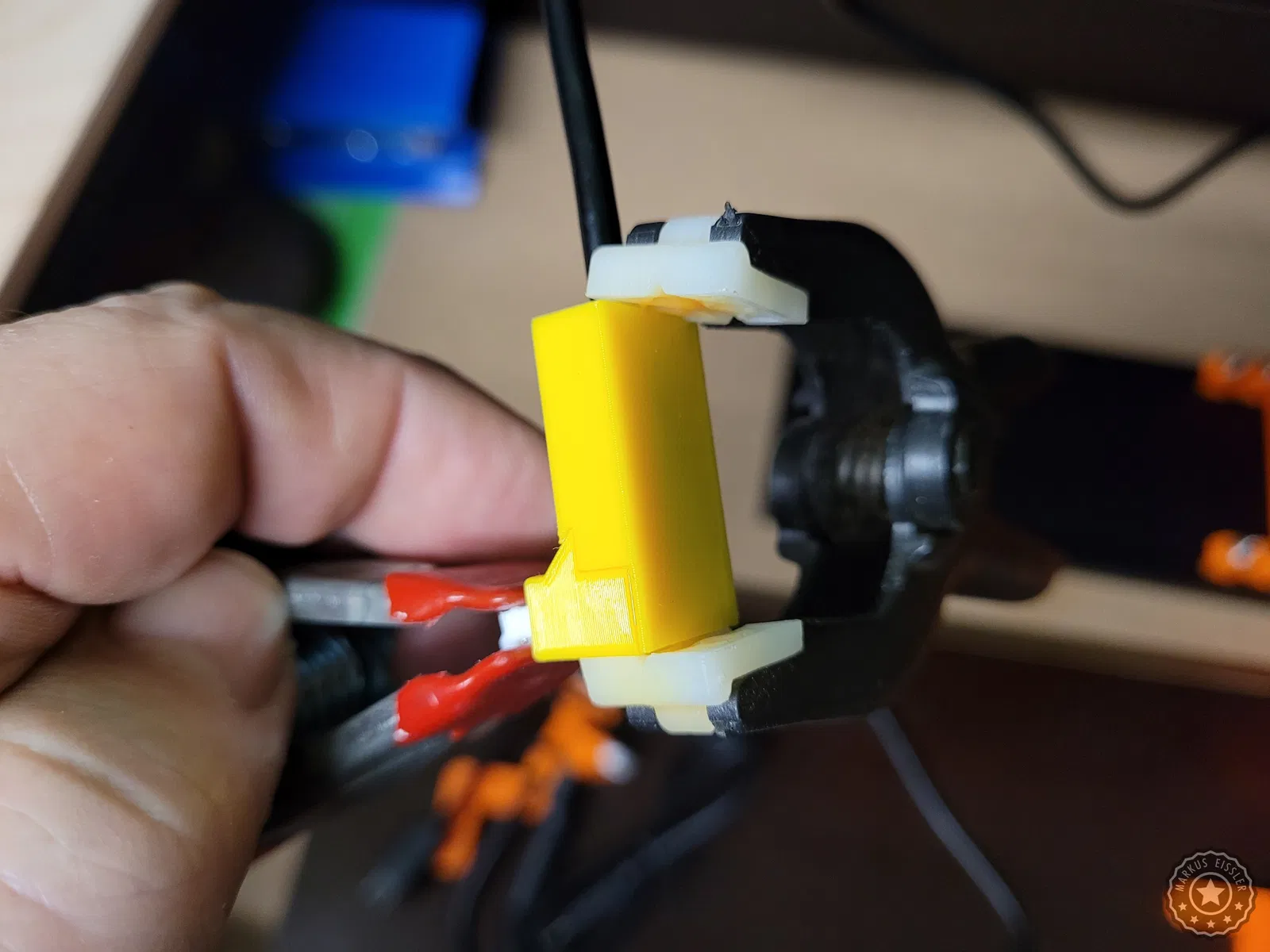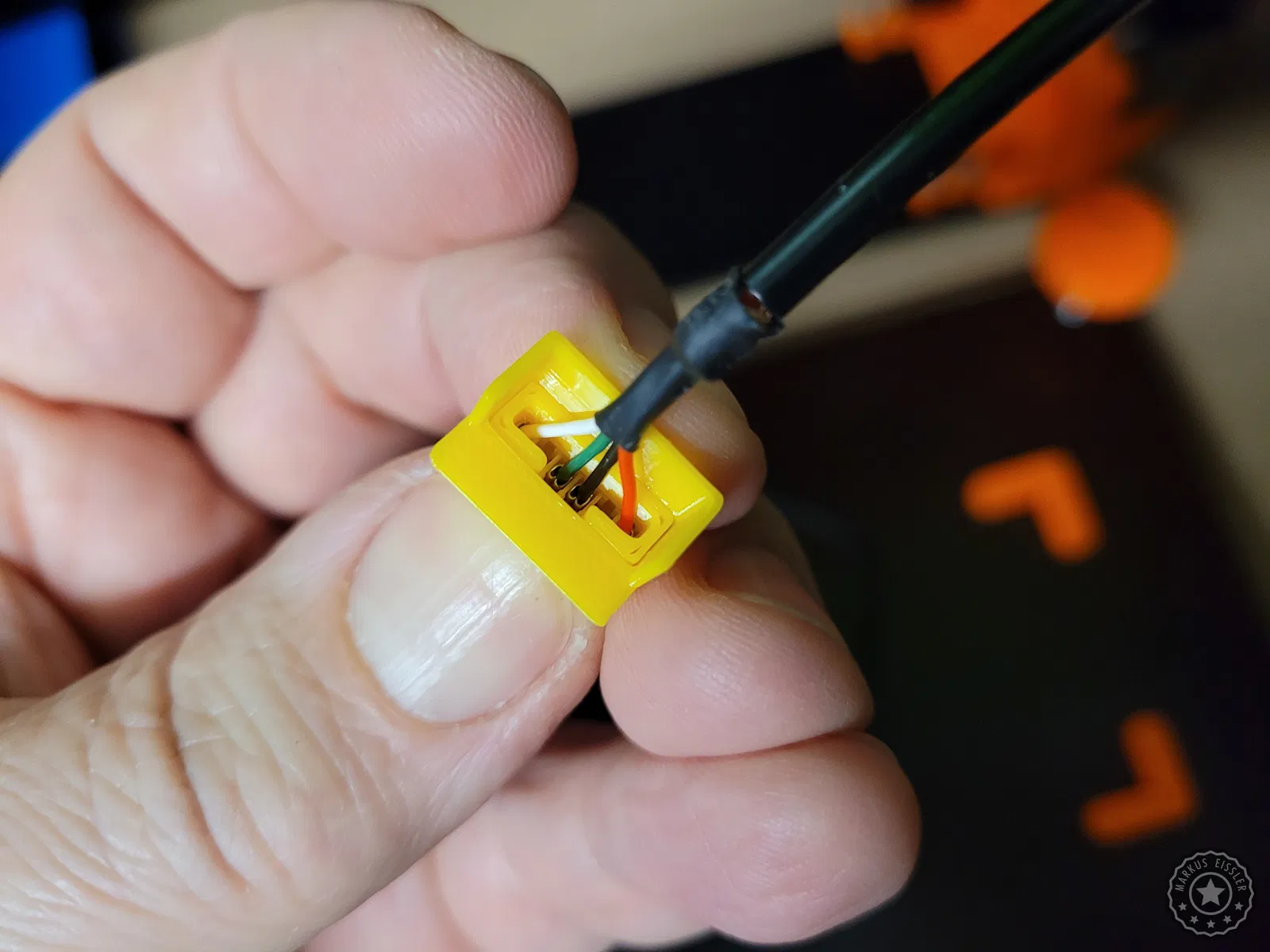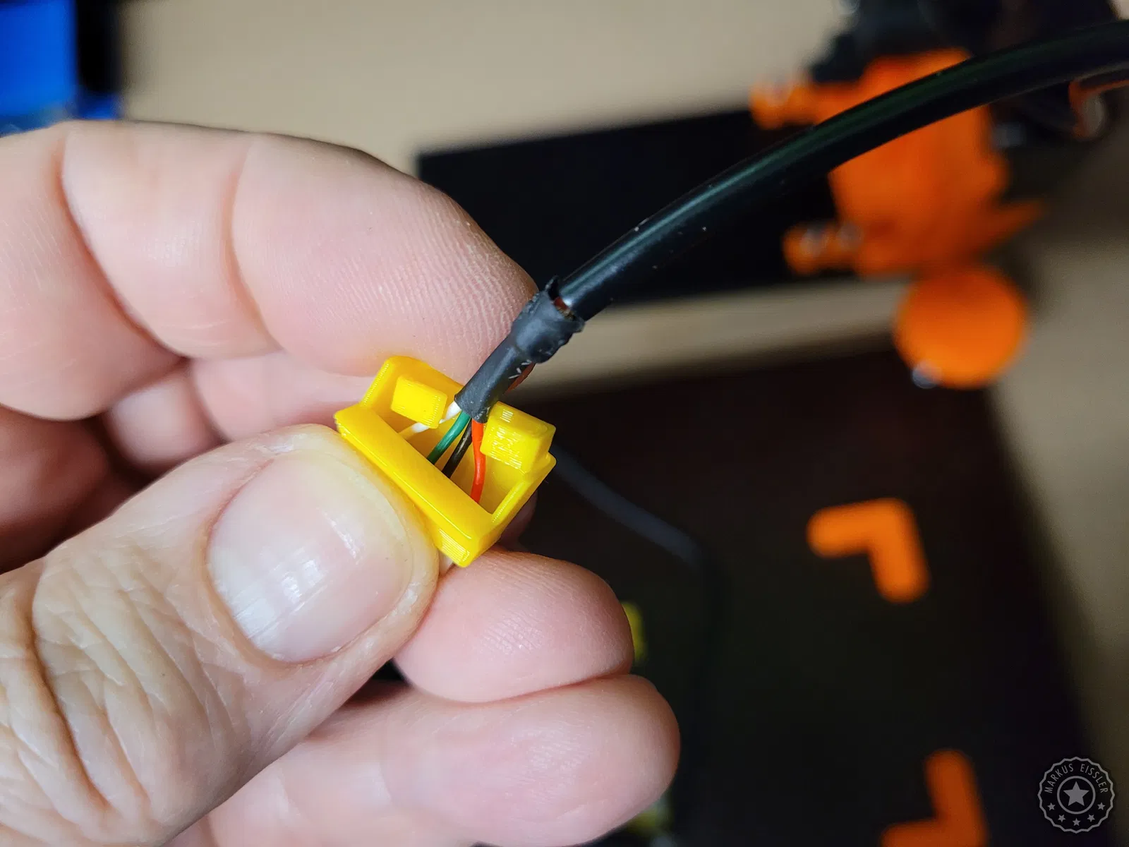 Để bảo vệ phần kết nối nhạy cảm giữa cáp và đầu cắm trên động cơ bước (stepper motor), mình đã thiết kế đầu nối góc này. Phụ kiện gồm có ba phần, được in bằng nhựa PETG với độ đặc (infill) 100%, các chi tiết sẽ được cố định lại với nhau bằng keo dán sắt (superglue).