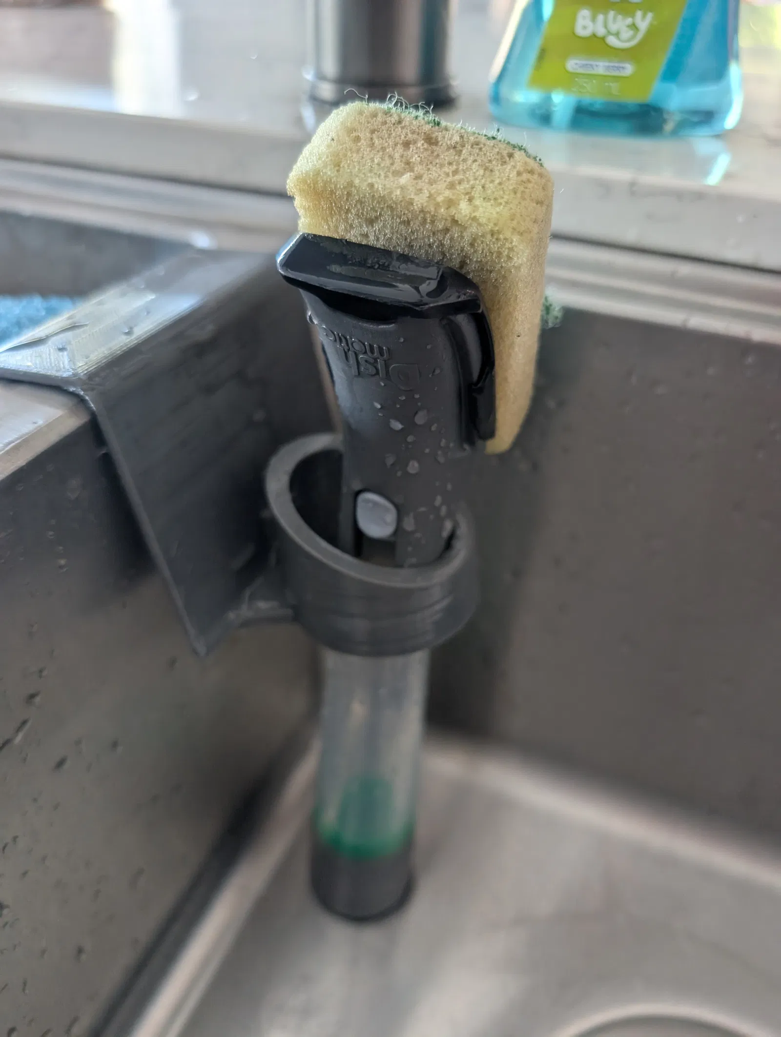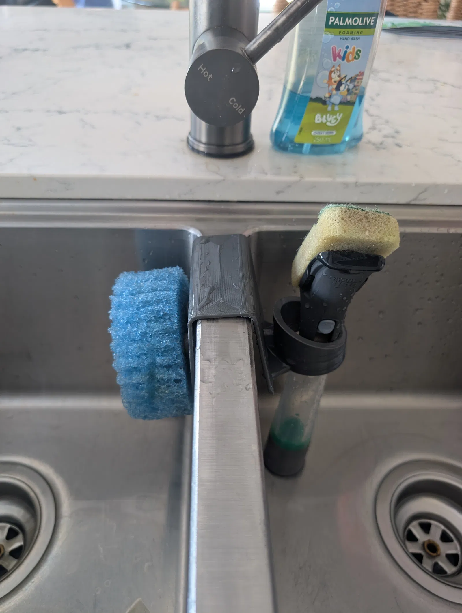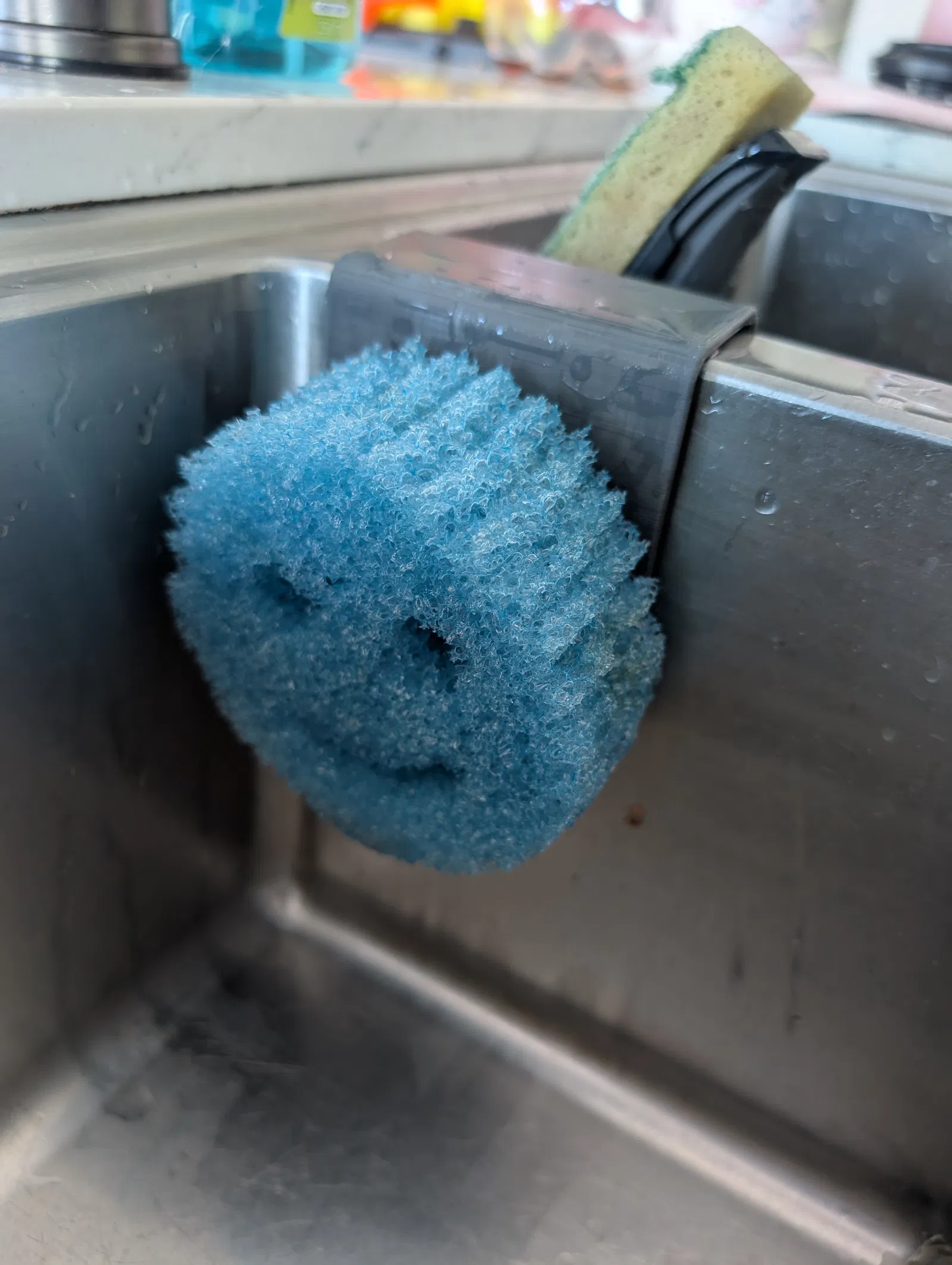 Điểm đặc biệt của thiết kế này là sự tích hợp "2 trong 1". Bạn không chỉ có chỗ để treo miếng mút rửa bát (rất hợp với dòng Scrub Daddy) mà còn có thêm một vòng giữ chuyên dụng cho cây cọ rửa cán dài. Việc này giúp các vật dụng không bị ngâm trong nước đọng ở đáy bồn, giảm thiểu mùi hôi và vi khuẩn phát triển, đồng thời giúp mặt bàn bếp của bạn lúc nào cũng trông ngăn nắp, gọn gàng hơn hẳn.