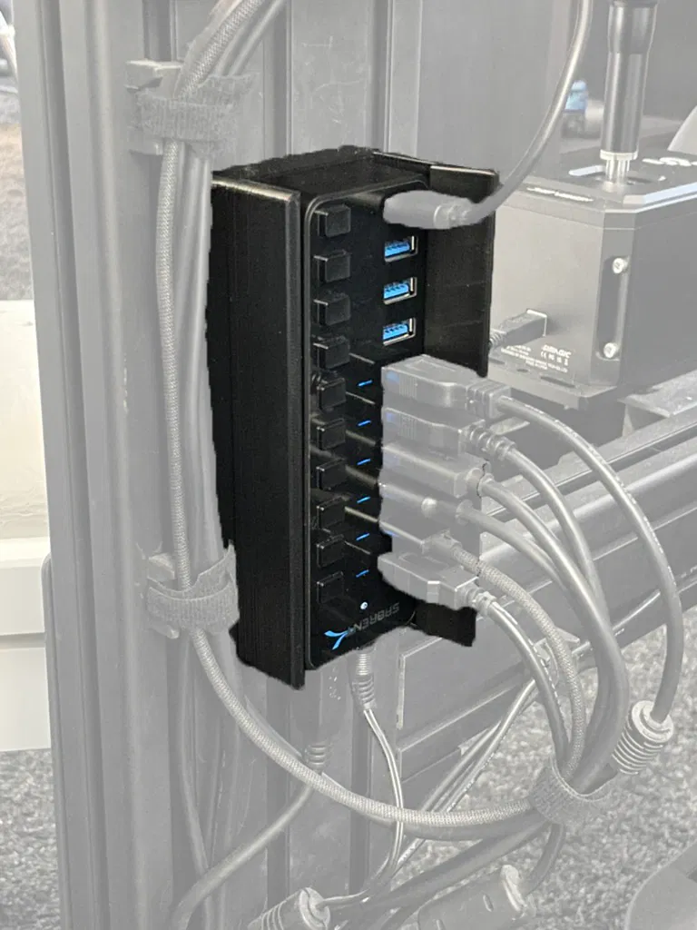 Giá đỡ cho hub Sabrent 10 cổng giúp quản lý dây cáp gọn gàng và bảo vệ các cổng USB. Thiết kế dành riêng cho khung nhôm sim rig (lắp bên phải), tương thích hoàn hảo với ốc M6 và M8.