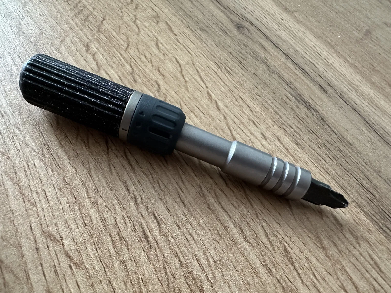 Phụ kiện tay cầm giúp biến Leatherman Ratchet Tool thành một chiếc tua vít bỏ túi tiện lợi. Thiết kế tối giản, ôm sát, dễ dàng tháo lắp mà không cần dụng cụ hỗ trợ. Phù hợp in với PLA hoặc PETG.