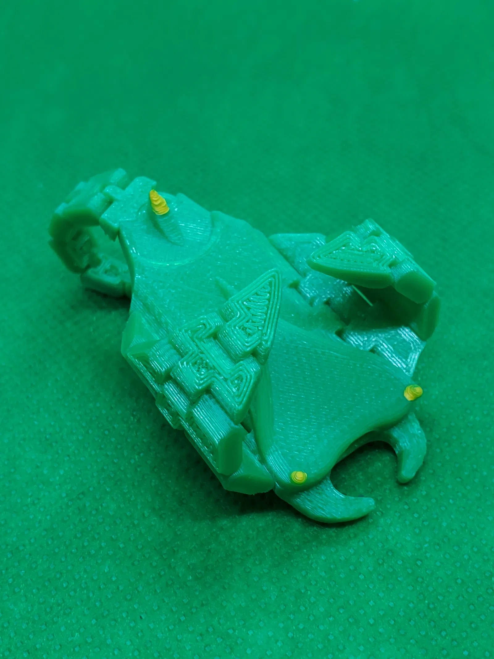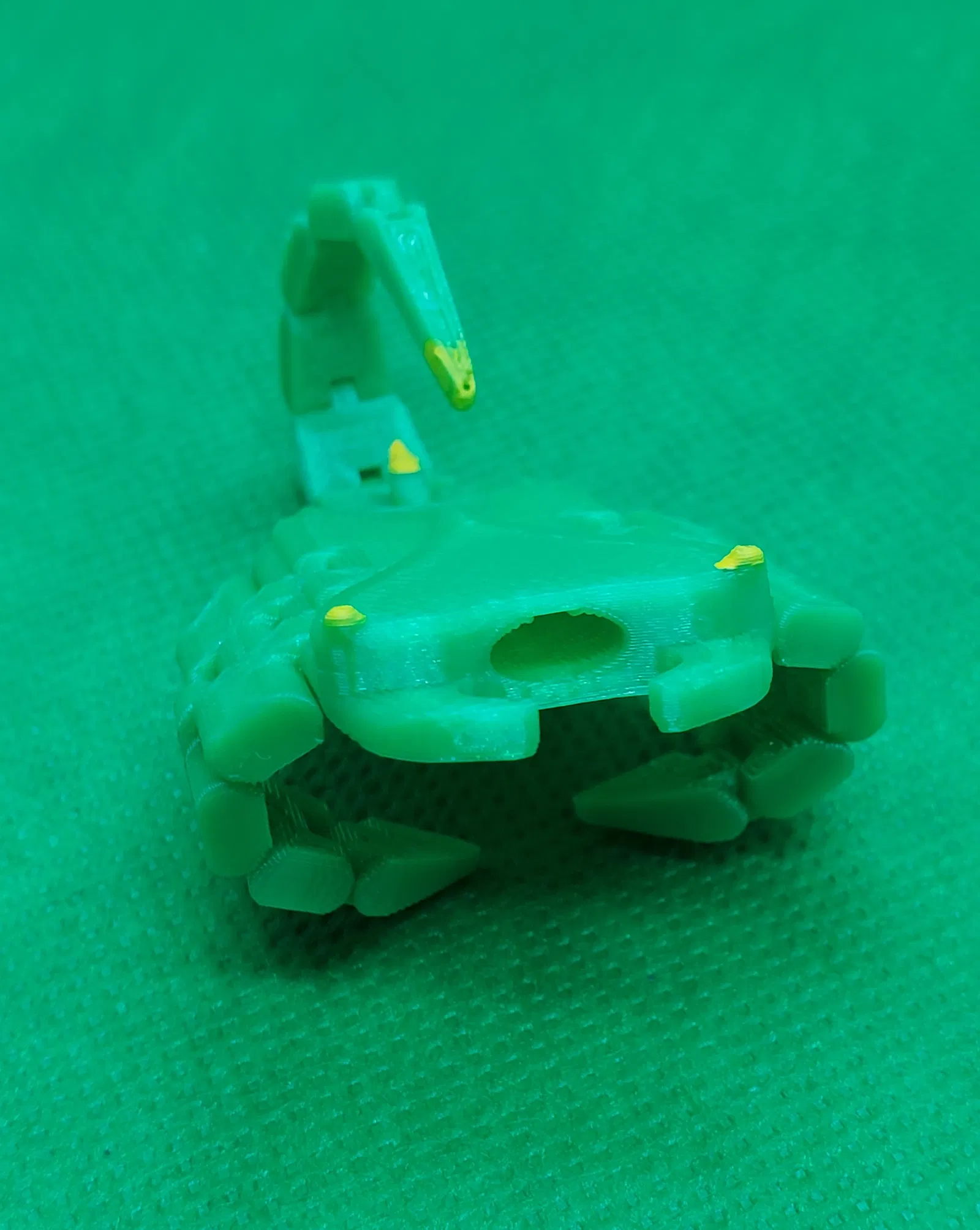 Bản in cập nhật là mô hình màu tím/vàng in ở tỉ lệ 100% (dài 9.5 inch, cũng là giới hạn bàn in của mình) và các bản màu xanh lá in ở tỉ lệ 40% (dài 3.75 inch). Nếu in nhỏ hơn 40%, các khớp sẽ bắt đầu bị dính lại.