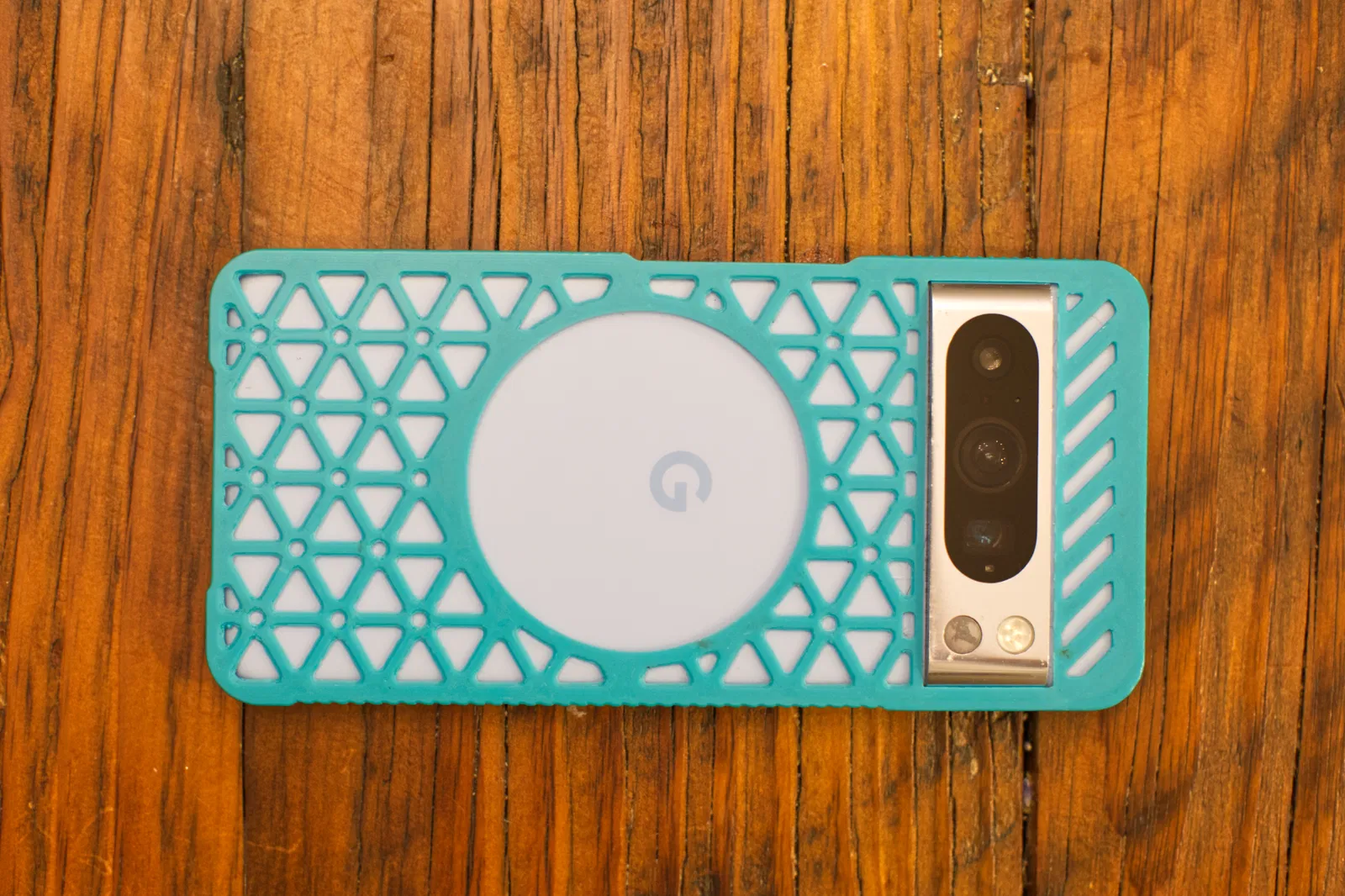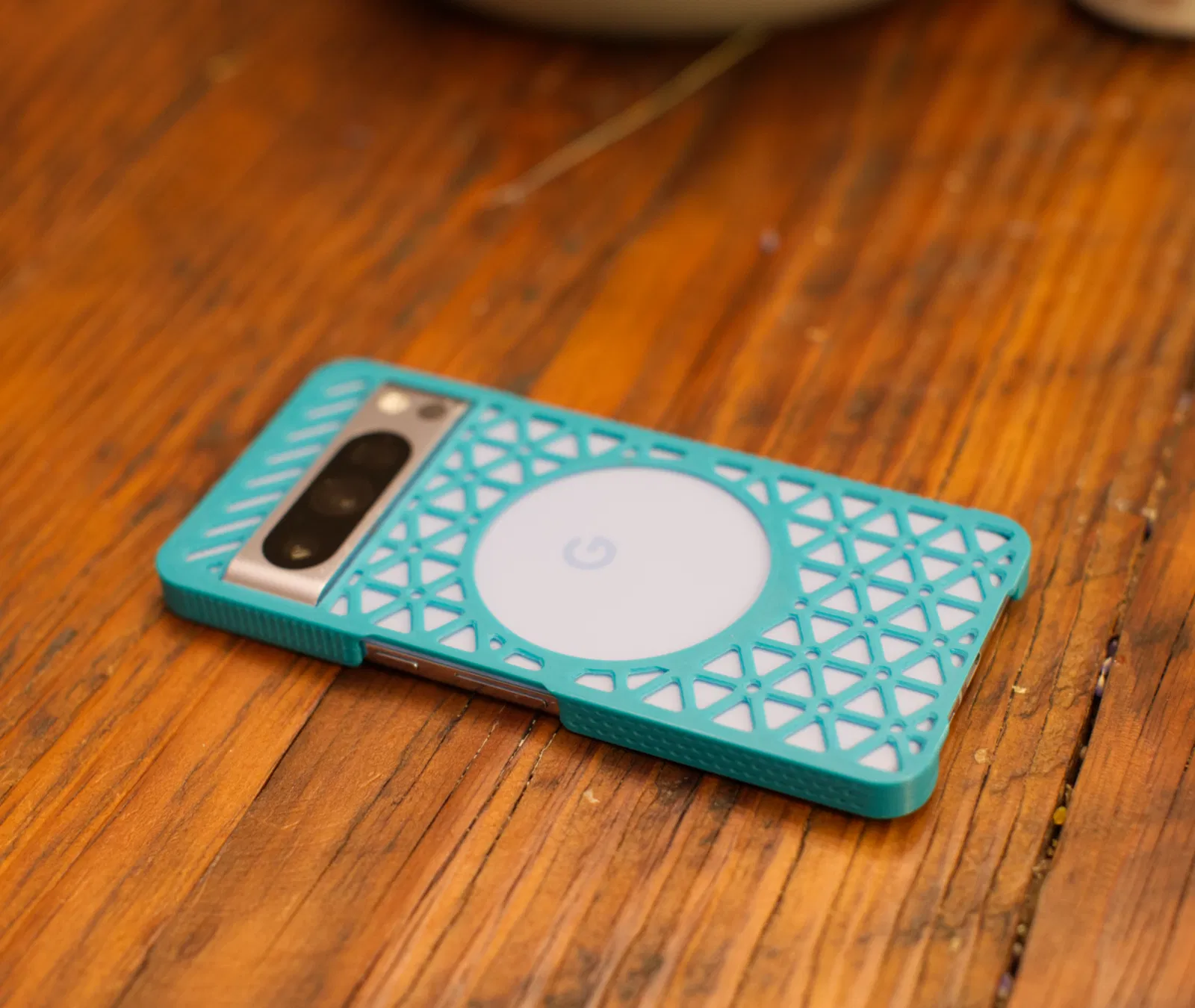 Ốp lưng dành cho Google Pixel 8 Pro với nhiều chi tiết bề mặt và các cạnh sắc nét. Mỗi mặt của ốp đều có những họa tiết độc đáo và thú vị. Sản phẩm có sẵn một vùng phẳng để bạn có thể thêm văn bản tùy chỉnh ngay trong phần mềm slicer. Lưu ý rằng ốp lưng này không bao phủ phần cụm camera. Thiết kế này giúp bạn cầm nắm điện thoại chắc tay hơn, đồng thời bảo vệ các góc và cạnh máy khỏi những va chạm nhẹ. Ngoài ra, ốp còn được thiết kế với khe hở hỗ trợ sạc không dây kiểu MagSafe (được căn chỉnh theo cuộn cảm ứng, không phải theo logo). Vì mẫu ốp này được thiết kế chủ yếu để tạo cảm giác cầm nắm khi để trong túi, nên không có cam kết bảo vệ toàn diện cho máy.