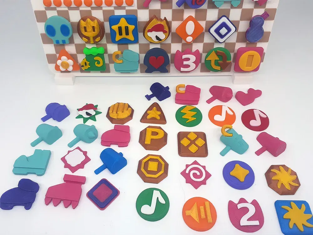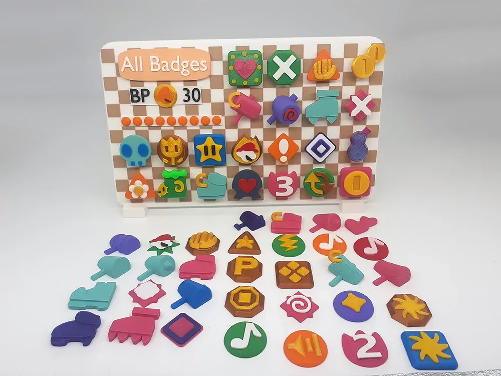 Mỗi huy hiệu đã sẵn sàng với các màu sắc để sử dụng trong tên tệp. Những huy hiệu này sử dụng màu sắc theo chiều cao lớp để đạt được màu sắc. Với ngoại lệ của các đòn tấn công smash, đòn tấn công jump, khiên gai, khiên lửa, spin smash, và sức mạnh băng, sleepy stomp, và flower finder. Những huy hiệu này có các phần in bổ sung dán vào mảnh gốc.
