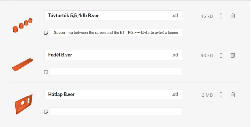 Các file "...B.ver.stl" được dùng để tiếp cận các cổng kết nối đa phương tiện. Nếu bạn cần, hãy in các file "...B.ver.stl" cùng với các phụ kiện cơ bản khác. Nếu không cần cổng kết nối media, bạn chỉ cần in các mô hình cơ bản là đủ.
