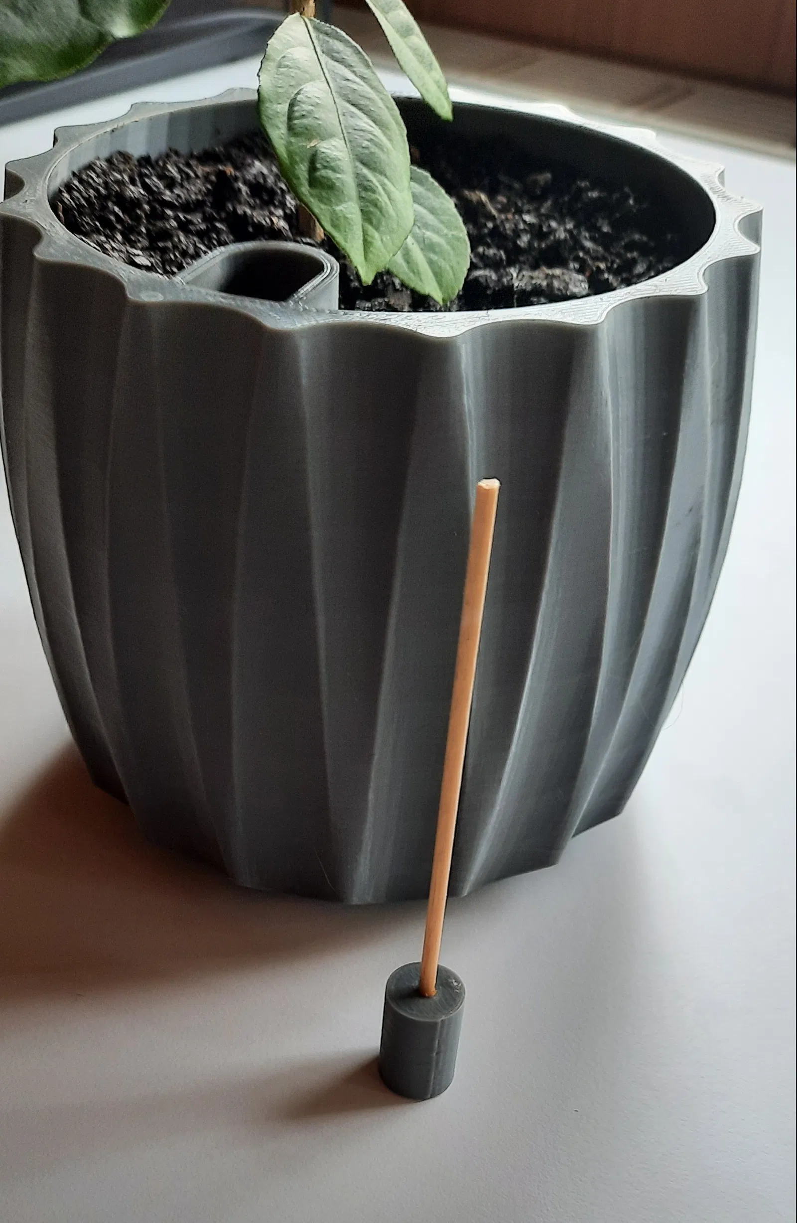 Chậu trồng cây tự tưới hiện đại có tích hợp thước đo mực nước. Bạn chỉ cần dùng thêm tăm hoặc que gỗ làm phao nổi. Phần đĩa lót cần in hai lần.