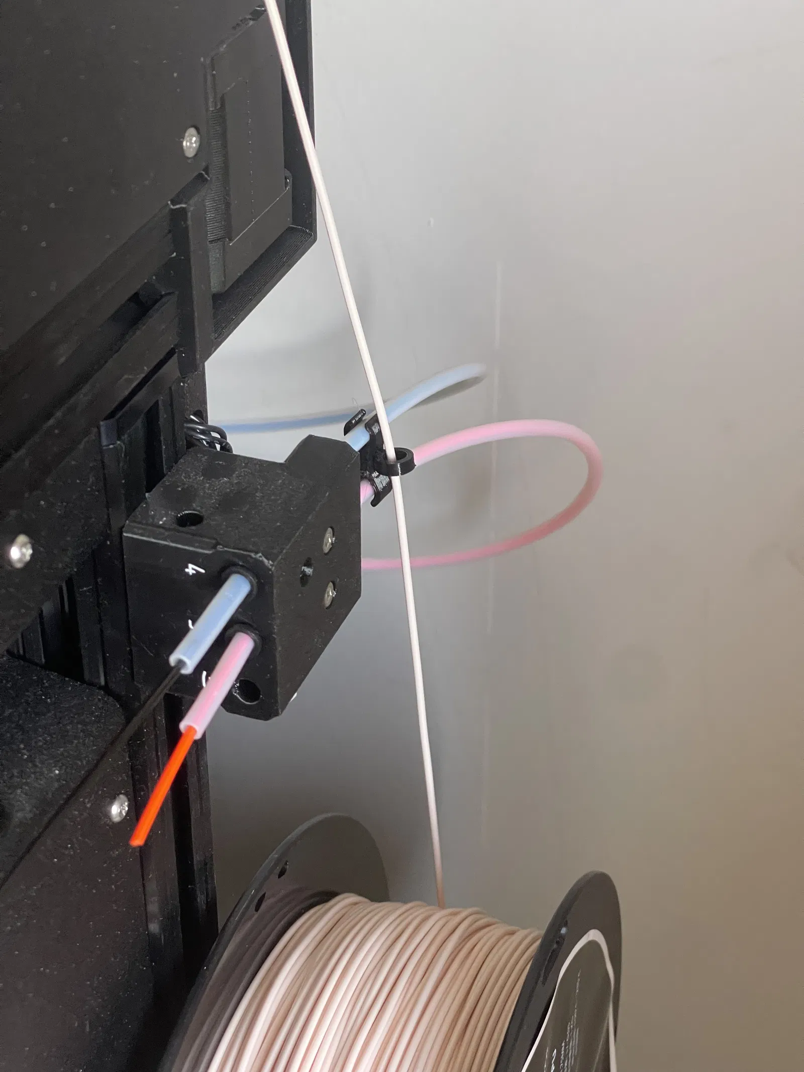 Việc sử dụng các loại sợi TPU cực kỳ dẻo với độ cứng 95A trên máy in PRUSA XL là một thử thách lớn vì ống dẫn PTFE tạo ra lực cản rất nhiều. Việc nối trực tiếp sợi nhựa từ cuộn vào đầu in không phải là giải pháp tối ưu vì nó dễ gây rối dây. Lúc đầu tôi định dùng các đoạn ống PTFE nhỏ để dẫn hướng nhưng rồi nhận ra mình đã hết sạch ống, thế nên đây là một giải pháp tạm thời nhưng lại hoạt động rất hiệu quả. Kẹp dẫn hướng này giúp định hình đường đi của sợi nhựa từ cuộn vào thẳng đầu in.