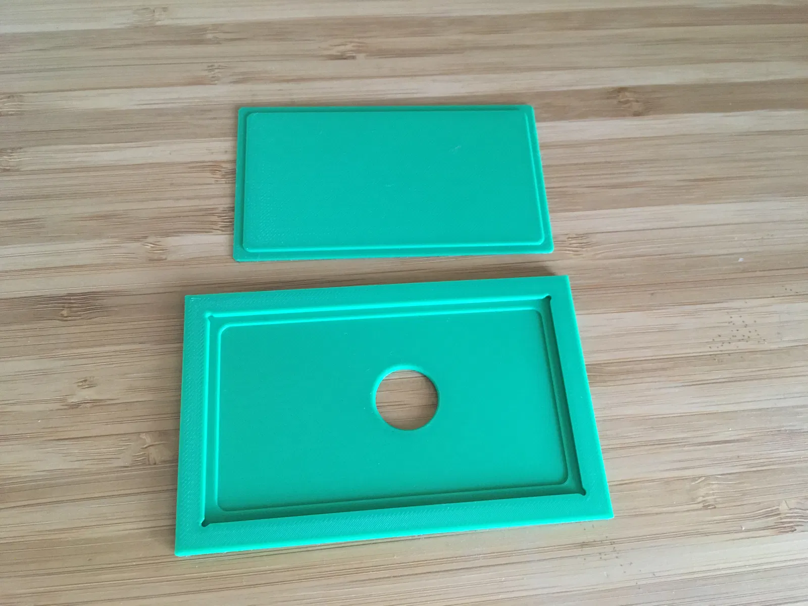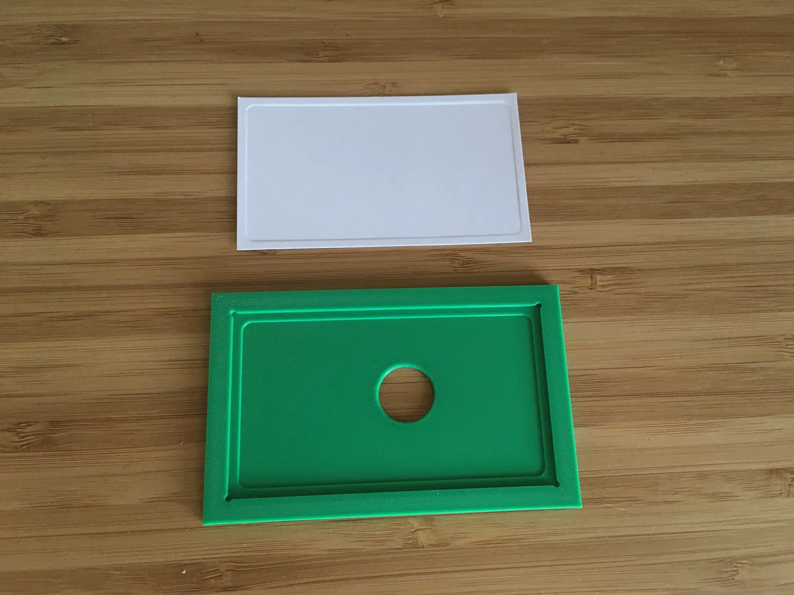 Mình bắt đầu bằng cách tạo một lỗ hình chữ nhật kích thước 3.5"x2" để đặt thẻ vào. Mình cộng thêm 0.004" (0.1mm) quanh chu vi để đảm bảo thẻ vào dễ dàng. Mình dùng độ cao dập nổi là 1/32" (0.8 mm). Hiệu ứng tạo ra khá tinh tế nên bạn có thể thử tăng độ cao lên. Mình chưa thử với các độ sâu khác. Sau đó, mình tạo một bề mặt offset 0.006" (0.15 mm) và chiếu phần dương (phần trên) của công cụ xuống bề mặt này.