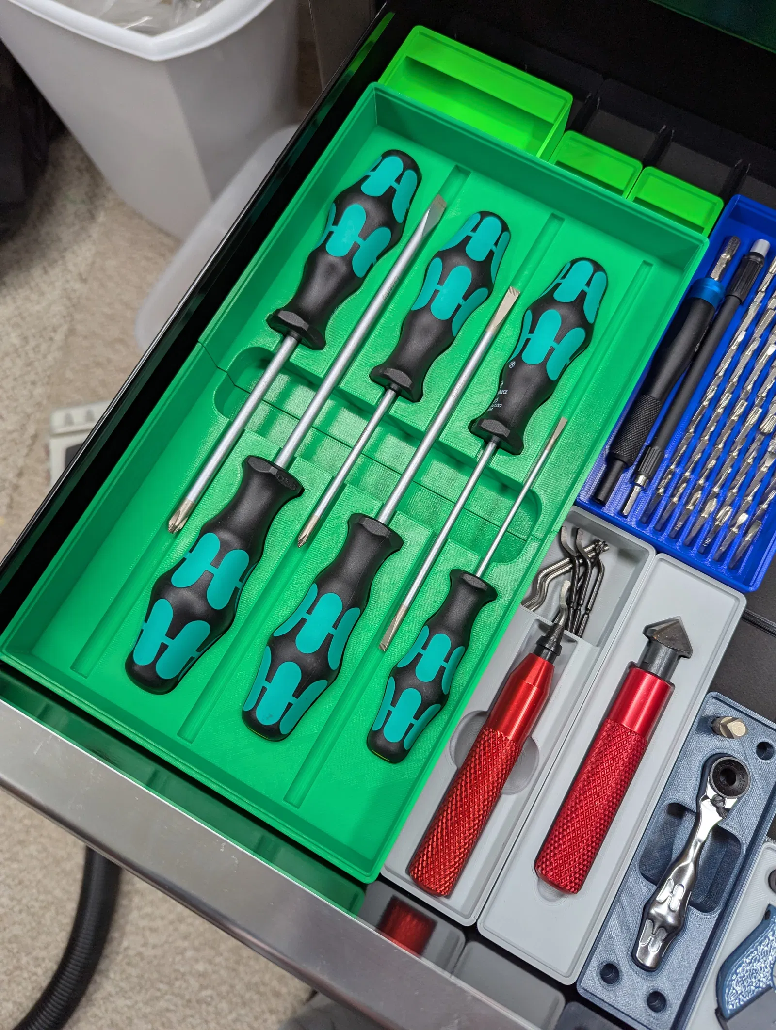 Tui không tìm được khay lưu trữ Gridfinity nào cho bộ tuốc nơ vít Wera Kraftform Plus 334/6 mua trên Amazon cả. Mấy mẫu khác thì kích thước không chuẩn nên tui quyết định tự thiết kế cái này luôn.